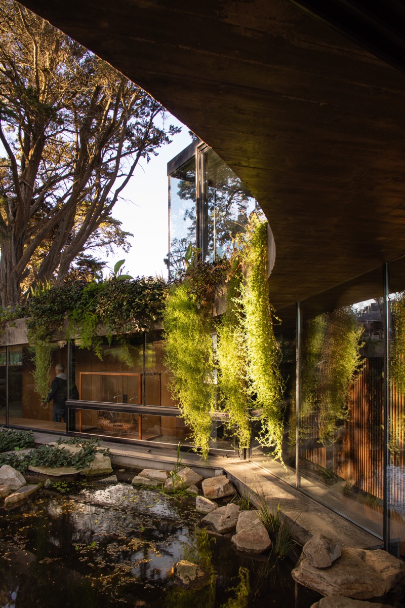 無論是那片綠色屋頂,或是忽隱忽現的鏡面形體,邊界的「無」、「有」藉玻璃、牆面、鏡面的開放與閉合,闢出一道道光與風的路徑,層疊出「景」與「居」交融的佈局,「空間」(space)因而在樹木、地貌與建築輪廓的框界中,形塑凝定成可感知的「空」(void)。