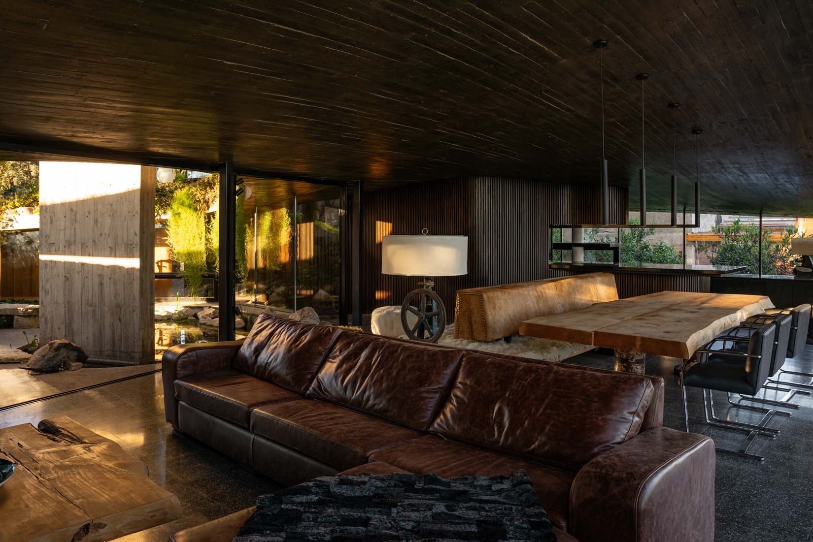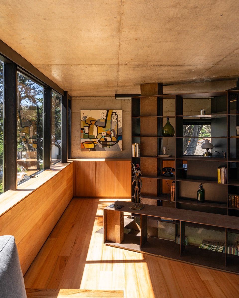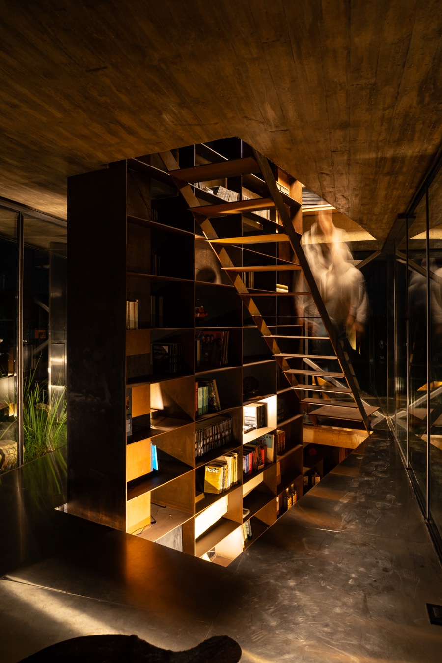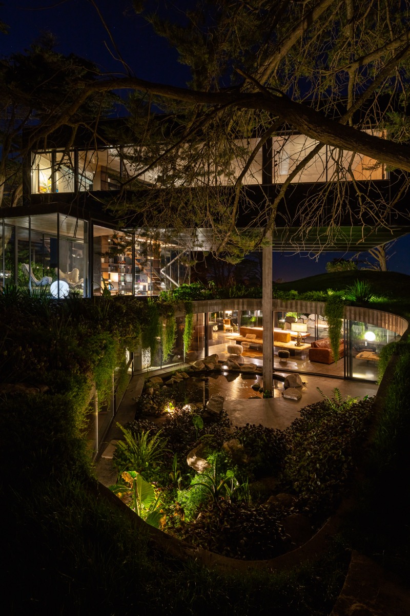 一座中央庭院引入明亮採光與通風,串連起屋內各個空間;而原有地形與這片「建築外衣」之間的「空隙」,則容納了幾乎整座房子的起居,隱沒在茂密生長的綠蔭,最終讓屋內日常消失於外界視線,人的動靜與蹤跡,便悄無聲息藏入自然的呼吸裡。