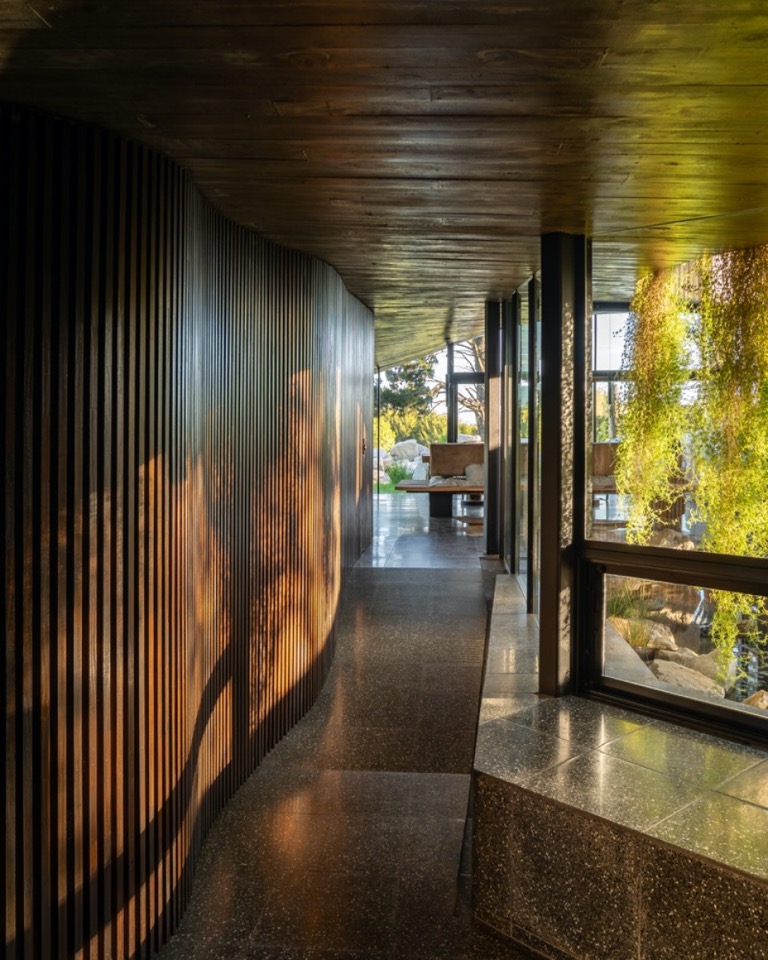 一層起伏如波浪的低矮混凝土結構,覆上植被順勢開展成一片綠色屋頂,猶如地景表面渾然天成的延伸皺褶,與周遭林地相映成趣。這片屋頂是 House Moro 最令人著迷之處,它既是建築的「外衣」,也是大地的「皮膚」,回應著原始的森林場景,也讓建築的存在輕輕融入地景。