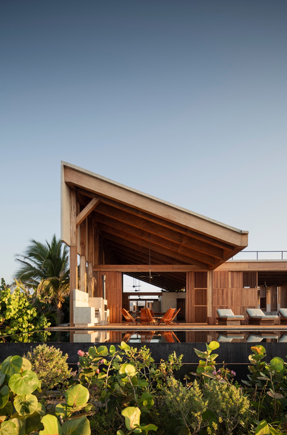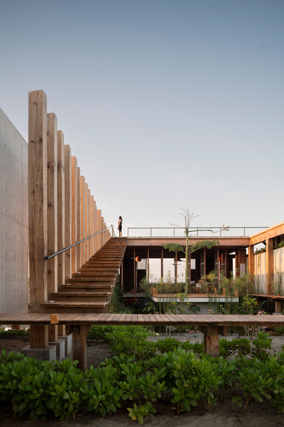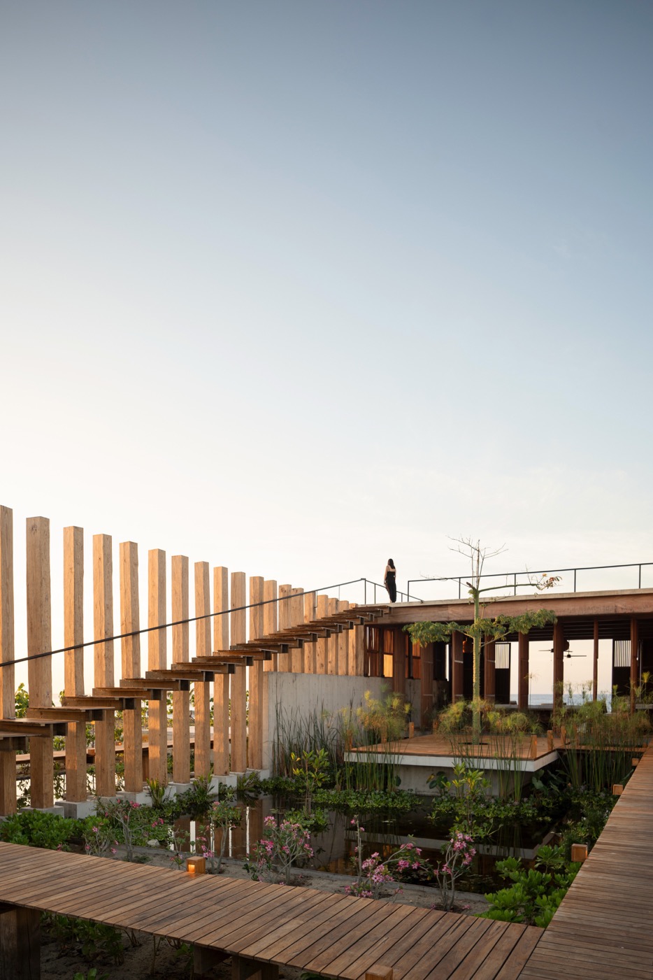 建築主體的中心是一座綠意橫生的的水景中庭,水面反映著天光,彷彿向海洋借勢,以一己之力穩定群島。隨著開放式的長廊棧道,串連起各個空間,讓建築內外不以牆面對立,而是由空氣、視線與微風引領著自然的動線。從公共空間到私密的睡房,從平面到屋頂,一道道木棧板鋪就連接成動線——這些橋與梯不僅是行走的過道,也是穿梭空間與自然的橋樑。