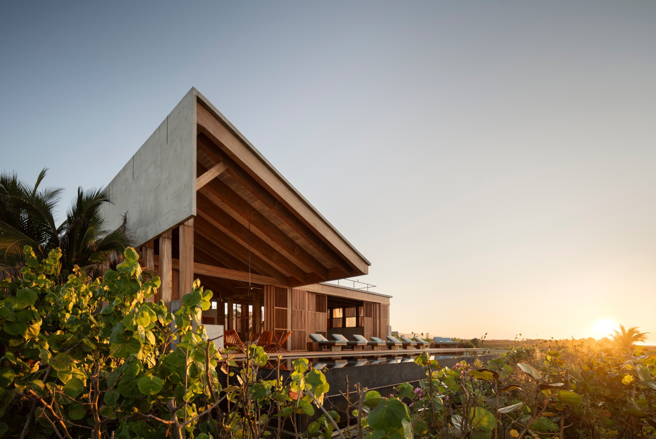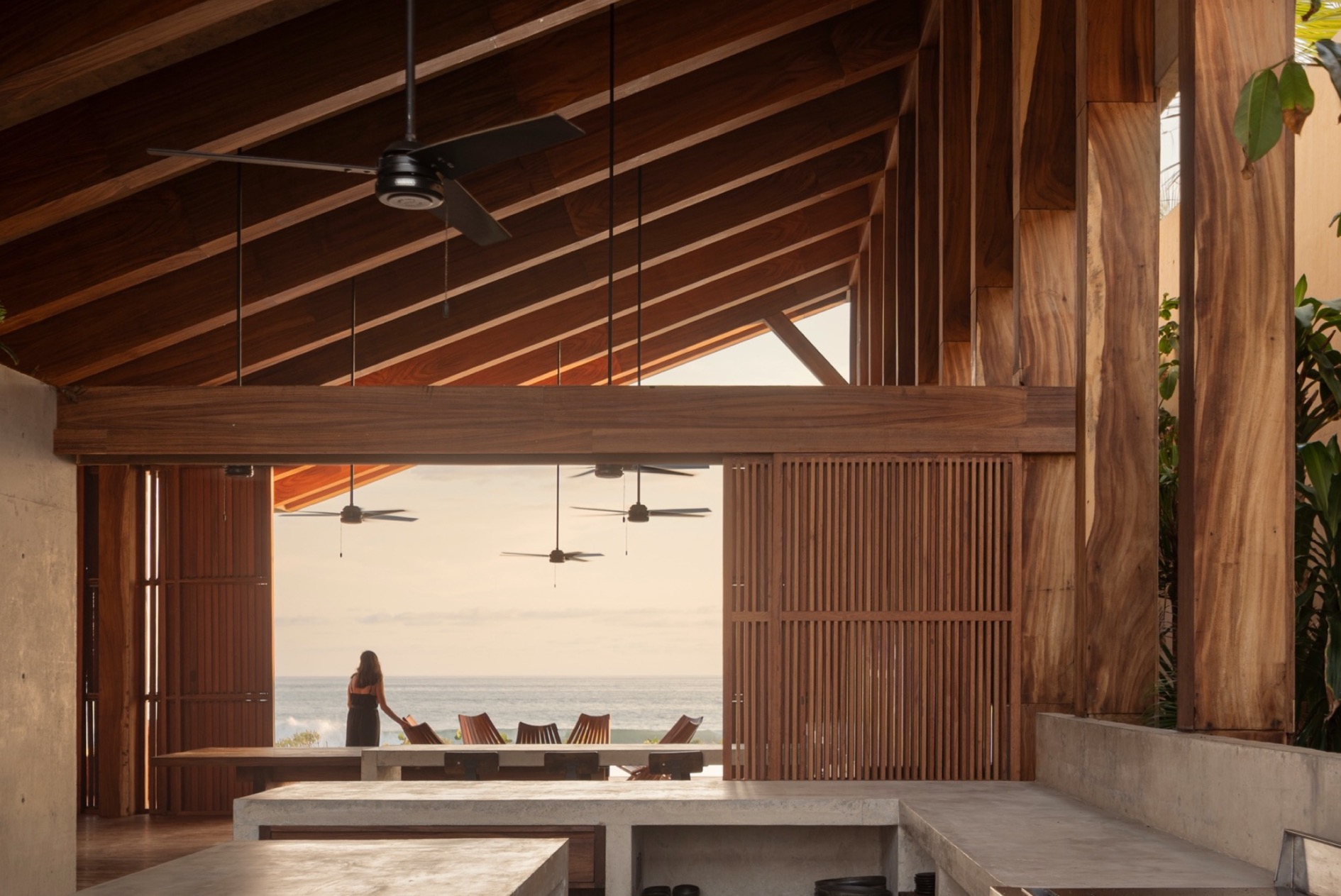 Casa Kani-Ini 主體結構由混凝土與木材構組而成,材質的溫潤與粗獷回應著海岸原始的地貌與氣候,外緣有面朝大海的無邊際泳池,內裡則是寬敞的公共起居間,足以滿足旅人的所有想望。客廳及幾乎一體成型的混凝土廚房開放通透,單斜設計的屋頂迎風切落日光,也讓客廳上方保有一片開放露台;駐足其上,登高遠眺的自由視野,無邊的海景與天際才是思緒的盡頭,也是建築賦予居住者與風景親密對話的所在。空間大面積的開口與穿堂,捎來太平洋海風的天然鹹味和適宜溫度,大自然原是這棟建築的日常。