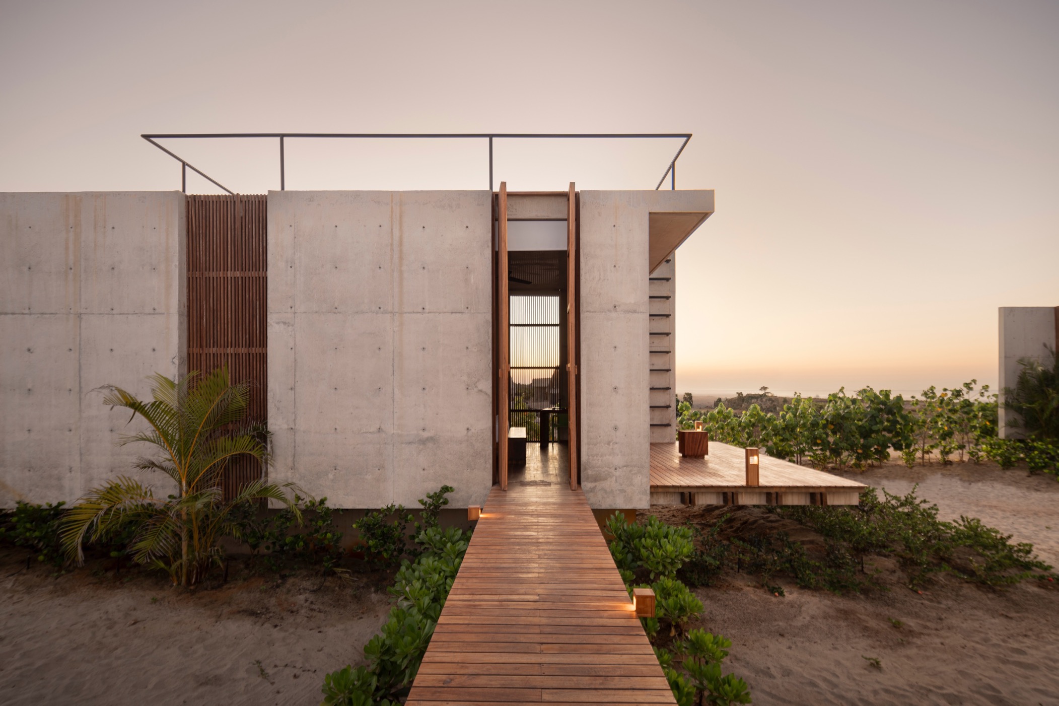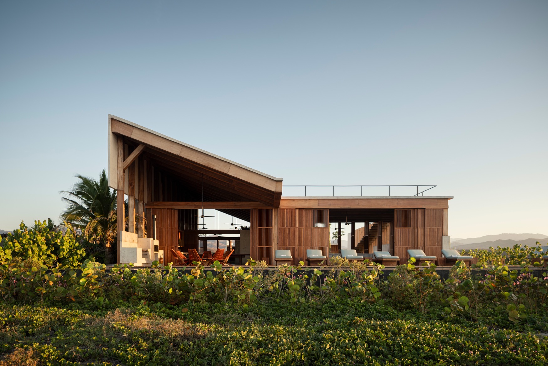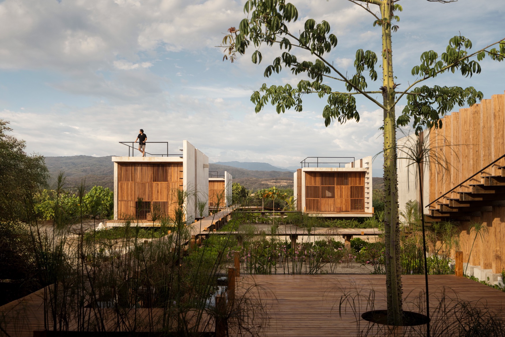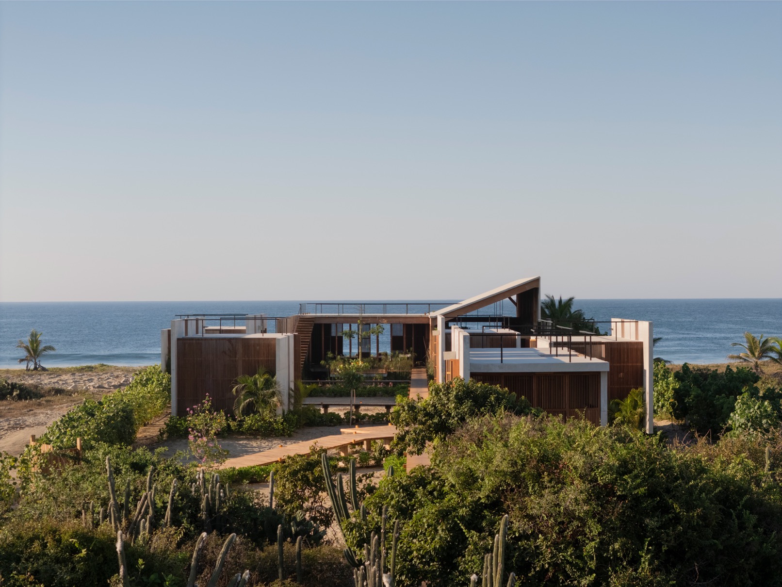 在距離埃斯孔迪多港約 30 分鐘的車程,由 TAC Taller Alberto Calleja 操刀設計的「Casa Kani-Ini」,便落腳於這片山海之間,佔地 4500 平方公尺 的遼闊面積,卻以對環境最小干預的姿態緩緩展開。設計團隊捨棄單一龐大的建築主體,以一組組錯落有致的獨立屋舍架起整體空間,像是被浪濤往山脈拍打上岸的不連續個體,卻又順著地勢與風向自然定位、彼此和諧。