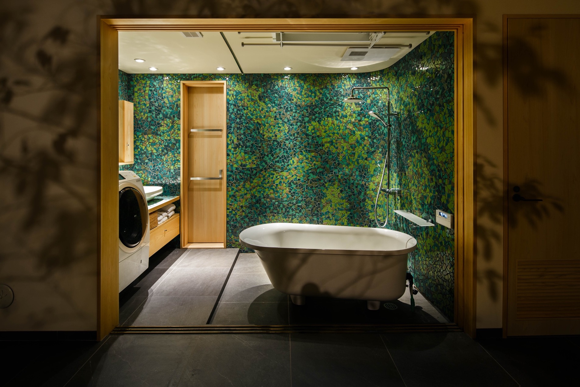 中央延伸的另一側設有主臥與衛浴空間,設計團隊以窗簾結合玻璃拉門的設計,讓泡澡時也能欣賞庭院樹影,加上牆面上以六種綠色馬賽克磚拼成的森林壁畫,在開放與親密之間,打造出如露天浴池般的體驗。