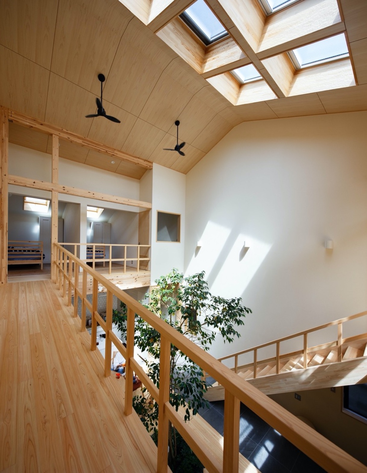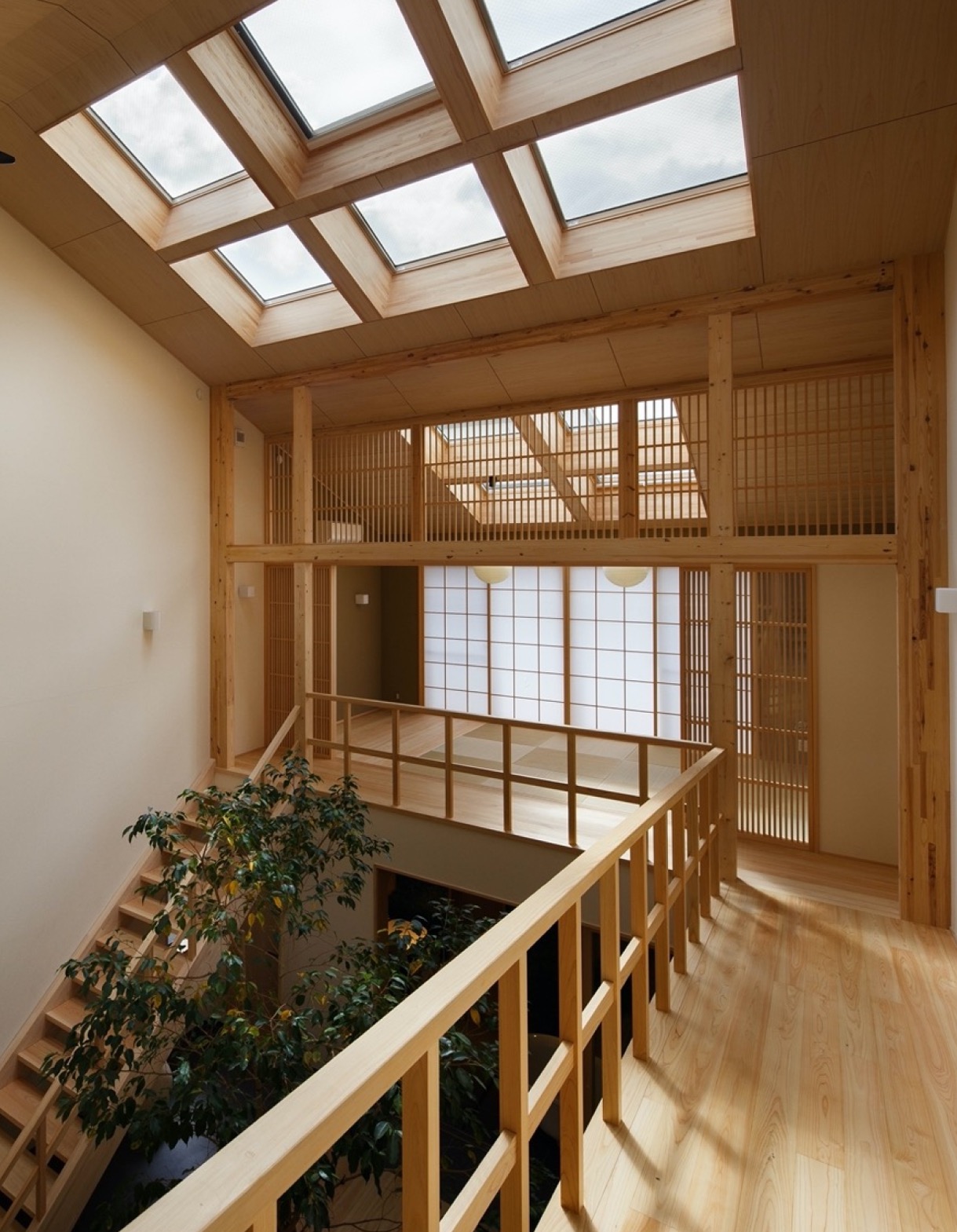 沿著樓梯上行,廊道沿著牆面環繞出動線,讓二樓望向中庭的視野開闊無礙,除了滿足屋主夫婦能隨時留意孩子們活動的需求,也讓室內充分沐浴在一片明亮。廚房上方排列著三間相同大小的兒童房,如同京都街道般整齊對稱;主臥上方則是兼具休憩與遊戲功能的榻榻米房,千本格子拉門與障子畫出層次分明的線條,日光或自天窗直撒、或穿透和紙,形成澄澈或柔潤的光影質地。