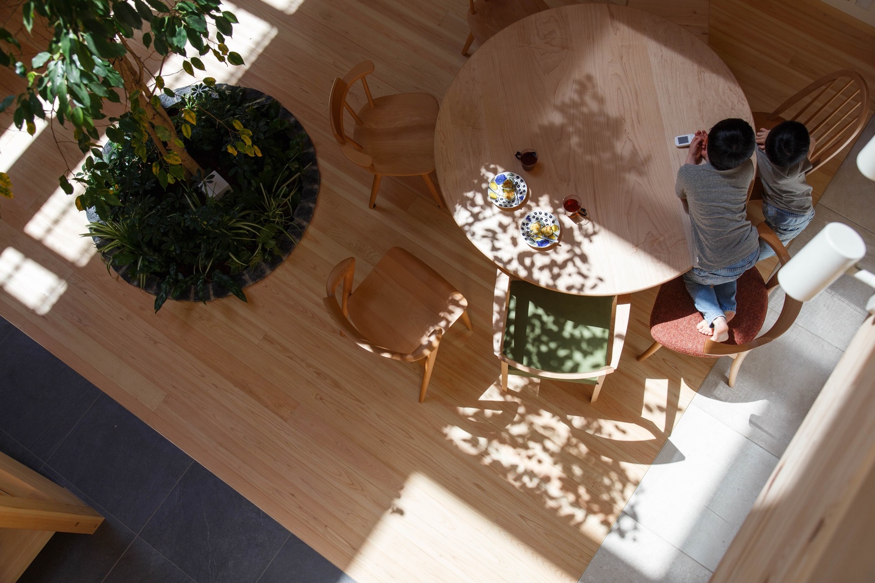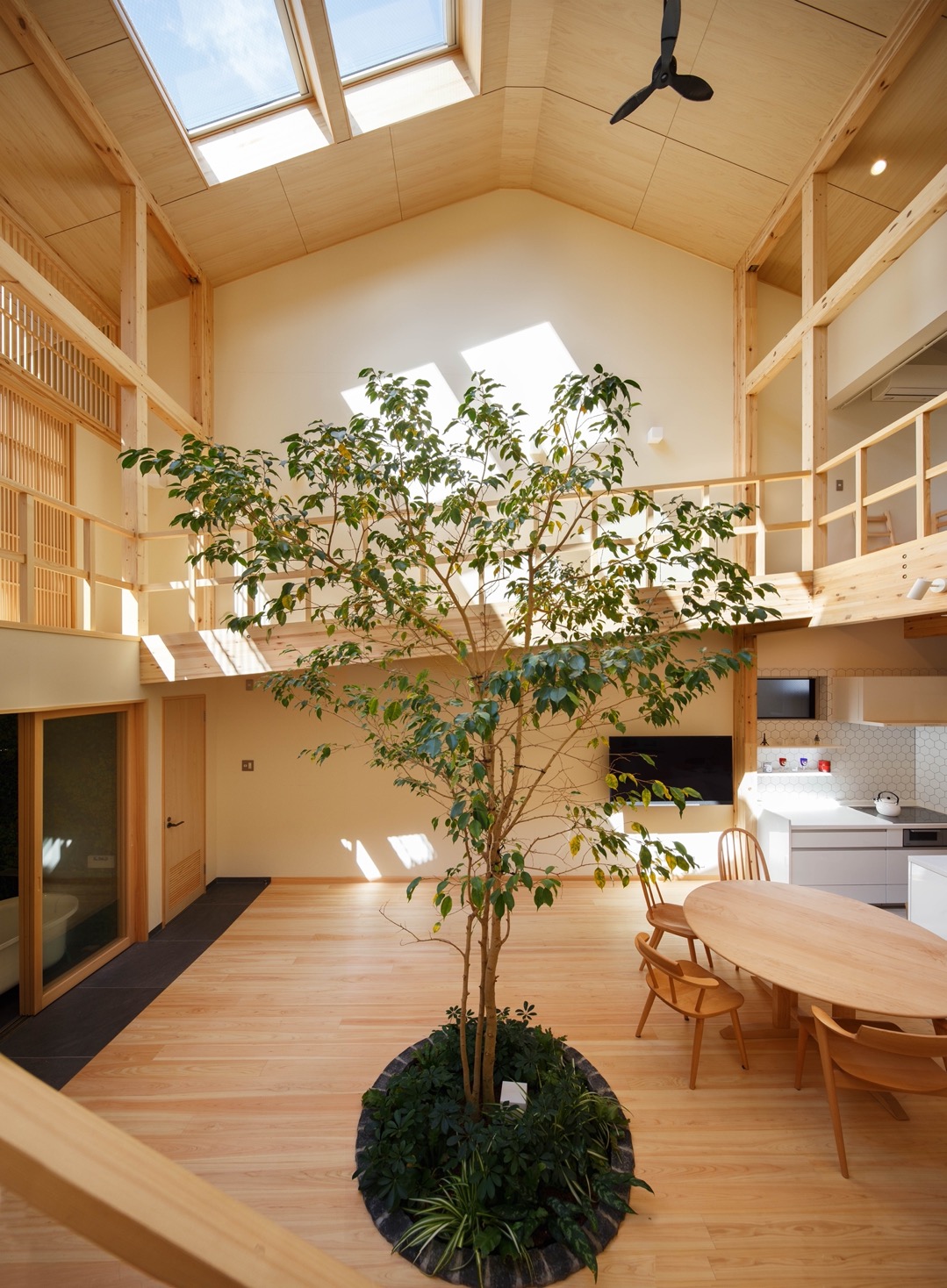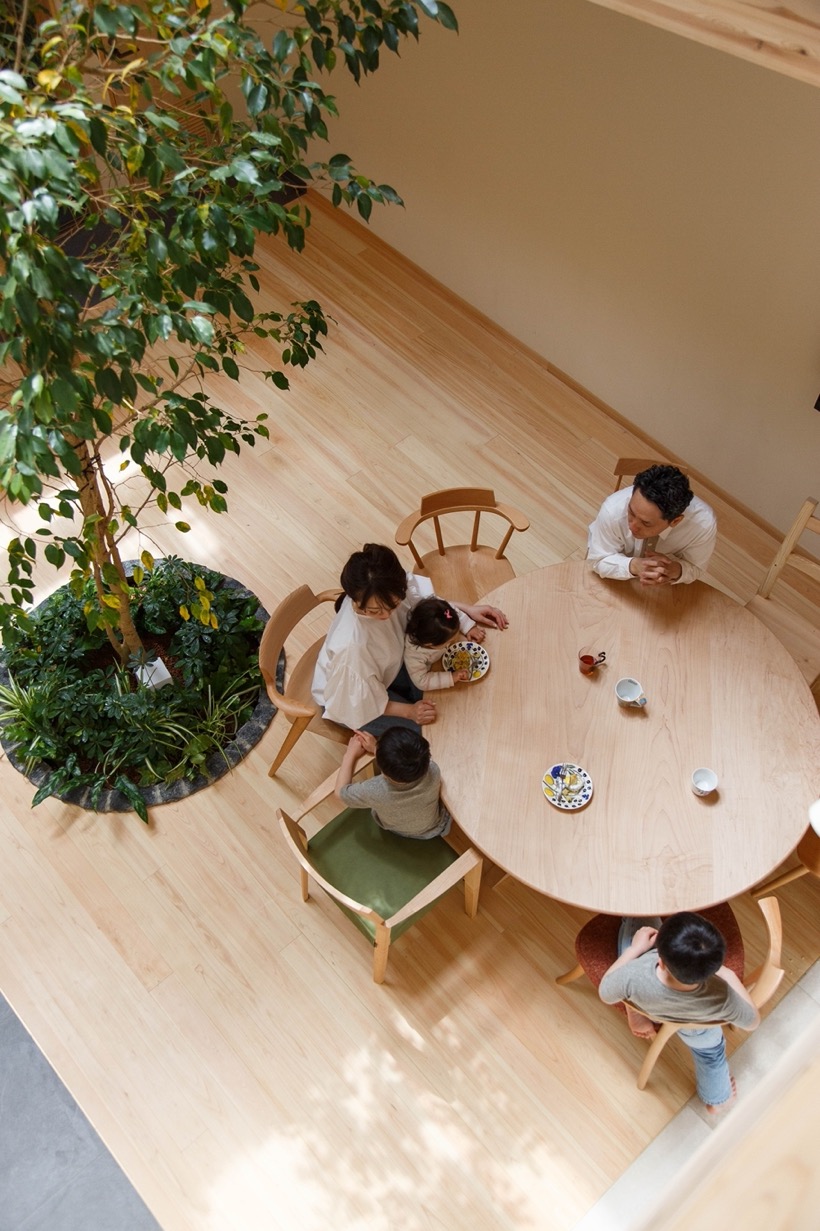 有別於以窗面或玻璃牆圈圍出的傳統中庭,設計團隊以單一開放式的格局,讓中庭與起居完好融合,形成一個雙層挑高的寬敞中軸空間。斜頂天窗層層鋪展出光影,不再被分割的空間宛如持續流動的整體,小樹得以和在孩子們一同在每日的晨光裡被喚醒;隨日子走過生活,逐漸豐厚的枝葉也將留下時間的痕跡,「此方天地」在 House in Kyoto 便具象了起來。