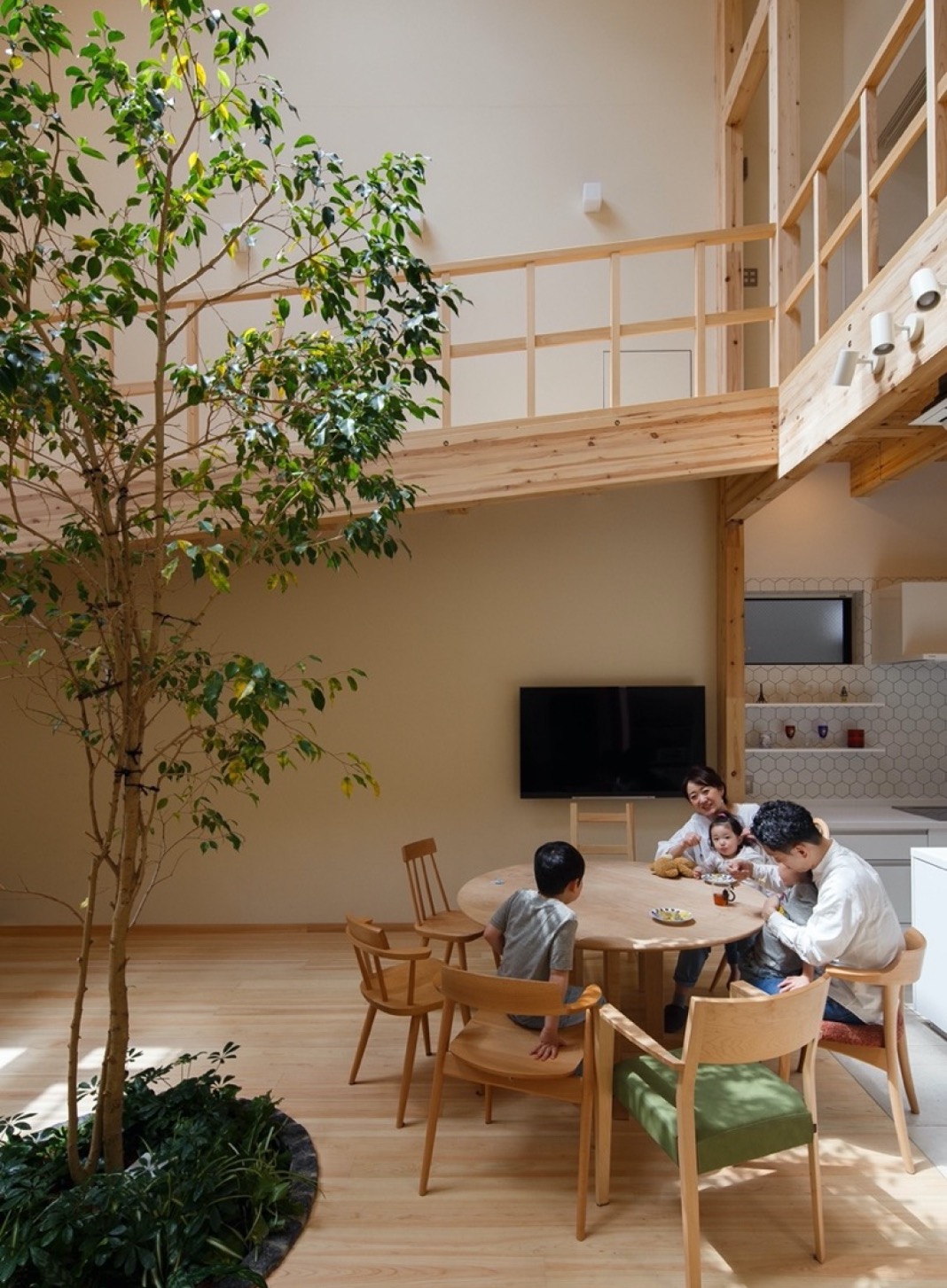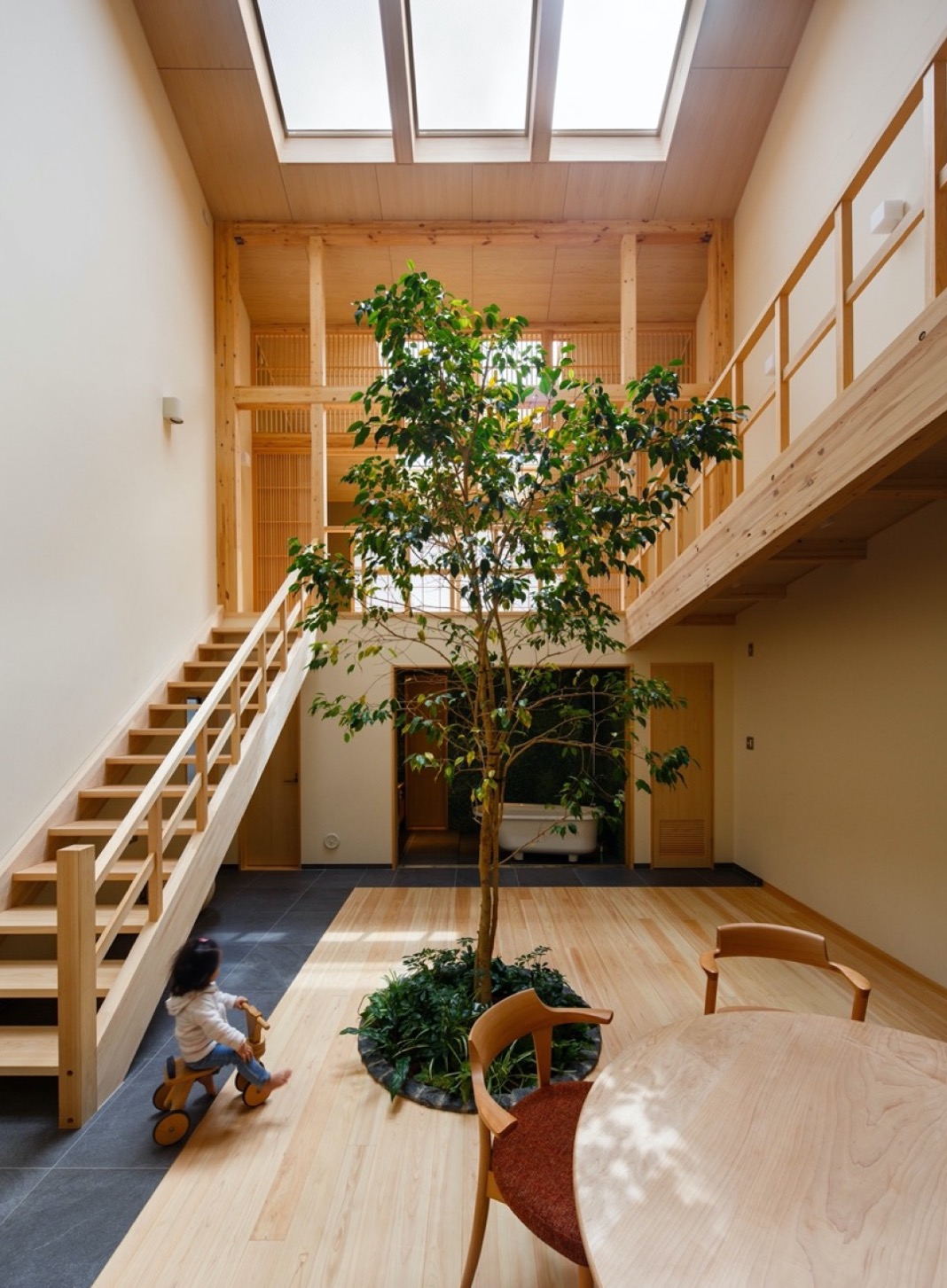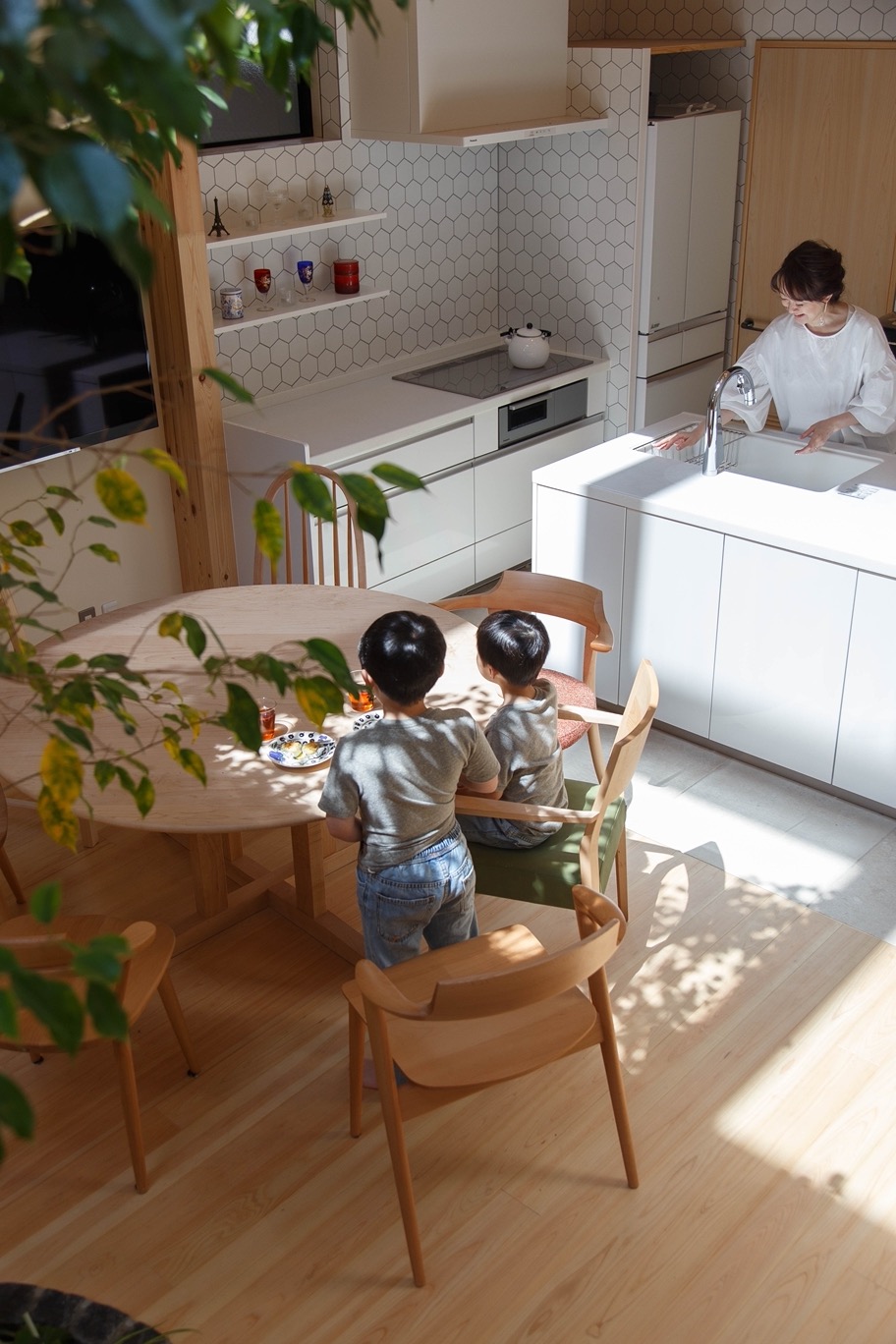 有別於以窗面或玻璃牆圈圍出的傳統中庭,設計團隊以單一開放式的格局,讓中庭與起居完好融合,形成一個雙層挑高的寬敞中軸空間。斜頂天窗層層鋪展出光影,不再被分割的空間宛如持續流動的整體,小樹得以和在孩子們一同在每日的晨光裡被喚醒;隨日子走過生活,逐漸豐厚的枝葉也將留下時間的痕跡,「此方天地」在 House in Kyoto 便具象了起來。