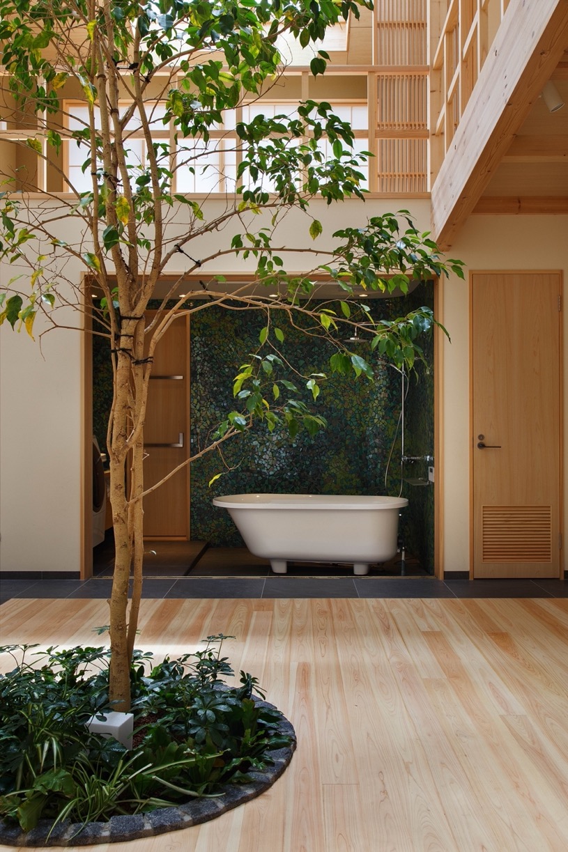緊挨著小樹的餐桌是一家人生活的核心,向側邊延伸出小巧的中島廚房,米灰與白的配色讓功能區的界線自然過渡;整體設計貼合著這座古都的氣質,大量的溫潤木質定調了整個家的氛圍,從地板、牆面、樓梯到隔屏,現代結構的簡約與日式木構感性交融,呈現出一種節制的平衡,也讓扁柏的清新氣味滲入每一處角落。中央延伸的另一側設有主臥與衛浴空間,設計團隊以窗簾結合玻璃拉門的設計,讓泡澡時也能欣賞庭院樹影,加上牆面上以六種綠色馬賽克磚拼成的森林壁畫,在開放與親密之間,打造出如露天浴池般的體驗。