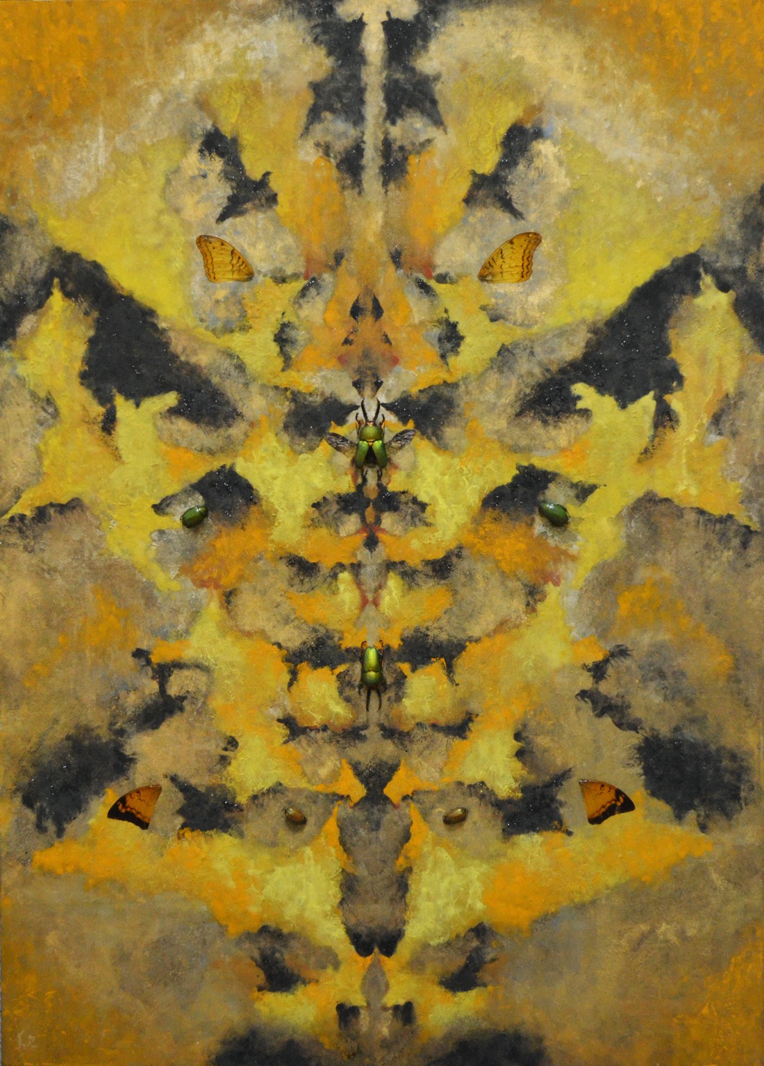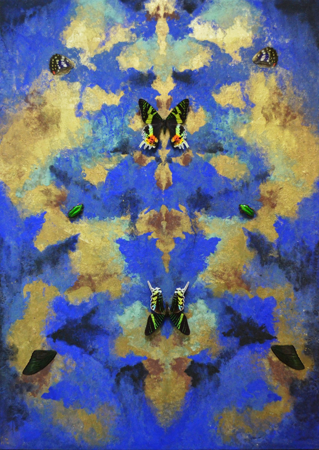 「蝴蝶在很多信仰與文化裡,象徵著人的意識或靈魂;而標本在科學實驗中,則是以一個生態的大群體進行採集抽樣。蝴蝶標本就像汲取出一個意識作為樣本,和我的想法很契合。」她將標本取代人像,從細緻地貼箔開始,依循當下心情繪製對稱的墨漬輪廓,再挑選與礦物顏料色彩呼應的蝴蝶。「我喜歡用流動的方式,讓畫面自行建構墨漬圖樣,有些細節則以手繪慢慢畫出。加上標本後,作品也會有非常大的改變,這種未知的不確定性,是我覺得最有趣也最迷人的地方。」