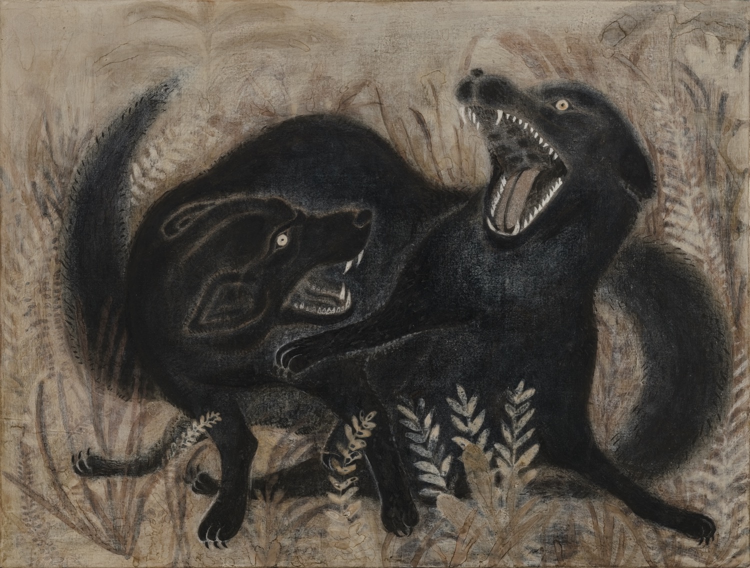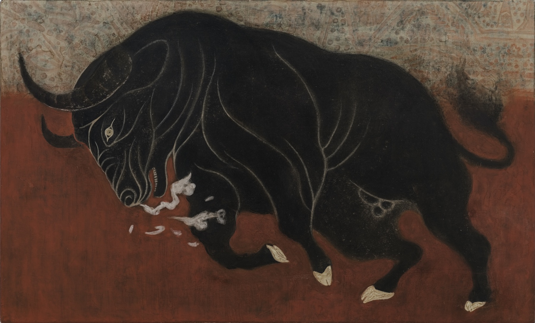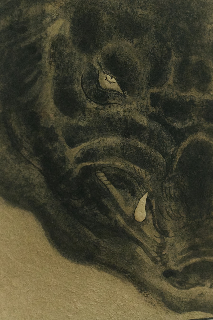 當人類帶著「馴服」的企圖,自然則以「搏鬥」怒吼,這些以動物為題的畫作因而不追求擬真,而是以生猛的原始張力,乘載每個生命掙扎於生存與生活的瞬間。「齜牙咧嘴的樣貌除了連結起古代繪畫形象,也讓畫面有舞台般的效果,就像有 spotlight 打在構圖上。對我來說,讓作品的線條與造型,帶有戲劇性一直都很重要。」但這些或驚恐、或憤怒的面貌,她卻是帶著傷感夾雜慶幸的矛盾情緒繪製,「默哀的是,我們再也回不去那個時期,沒辦法感知那種決絕與驚心動魄。但同時也很慶幸,不用像古人一樣賭上生命去搏鬥,以一種舒適、安全的姿態去認識動物。」