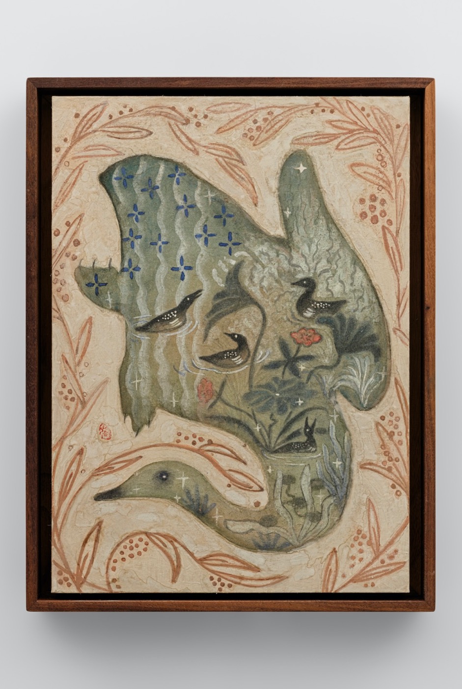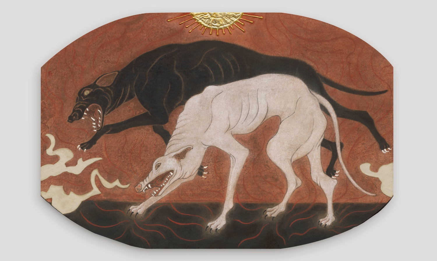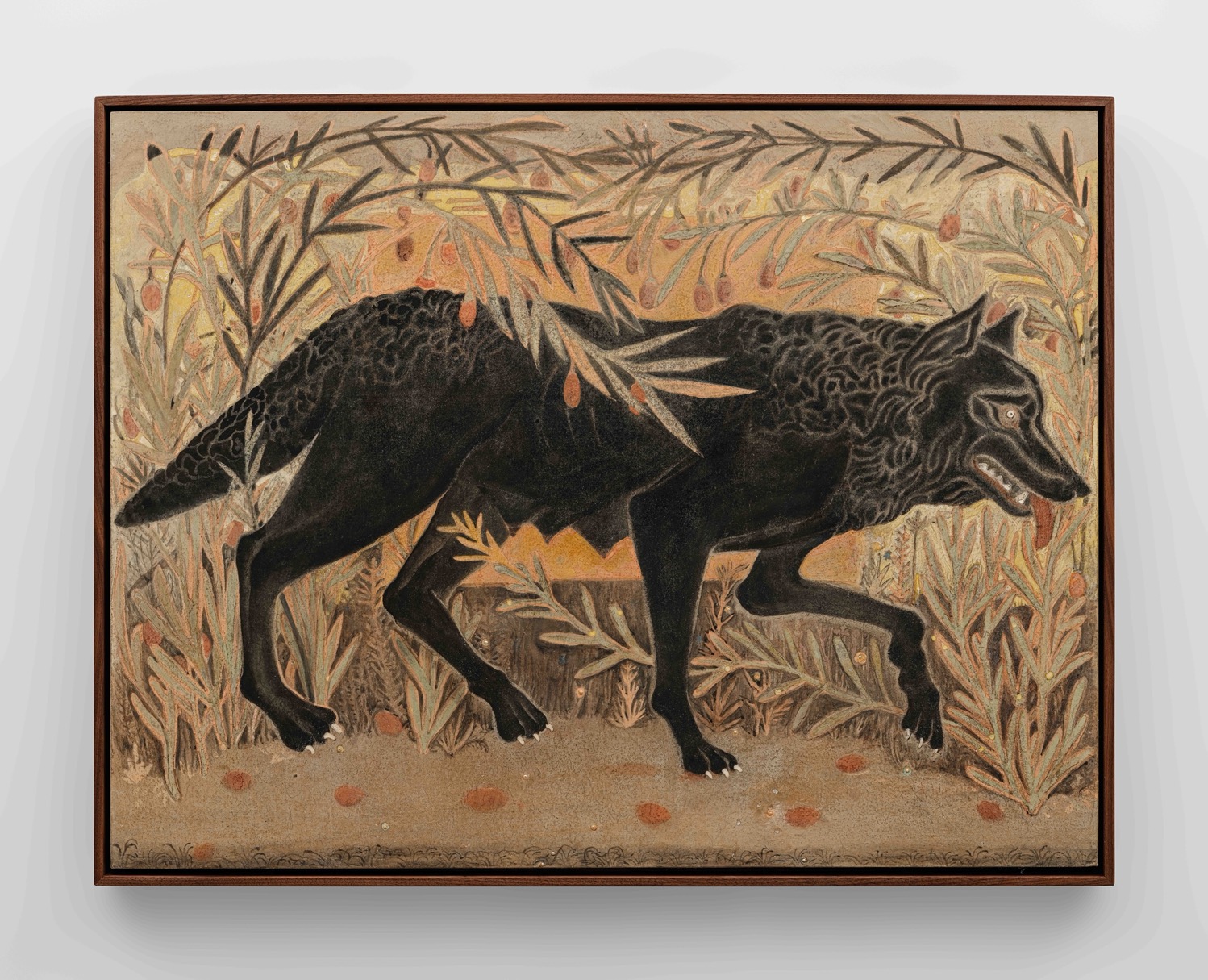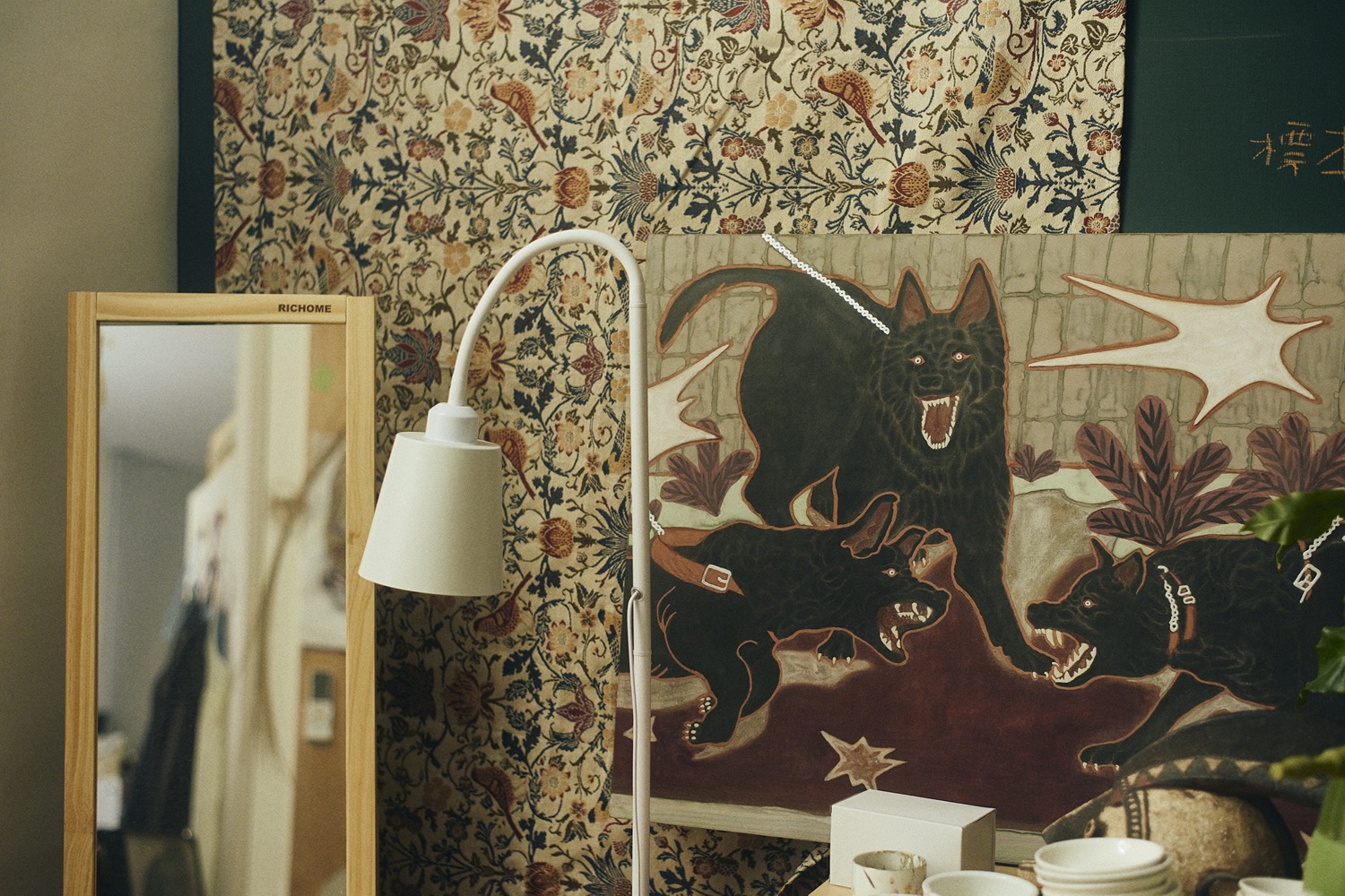 從繪畫視角到生活狀態,洪永欣除了以畫筆探討人與動物的關係,也自東、西方的裝飾藝術裡汲取養分——無論是新藝術的流動曲線、拜占庭藝術的華麗鑲嵌、或是中世紀手抄繪本的細膩工筆,在斑駁沉色的基底上,各以排列、對稱的重複性結構,交錯蔓生出旋律般的植物花草,譜出輕快或平靜、愉悅或沈緩的視覺節奏。
