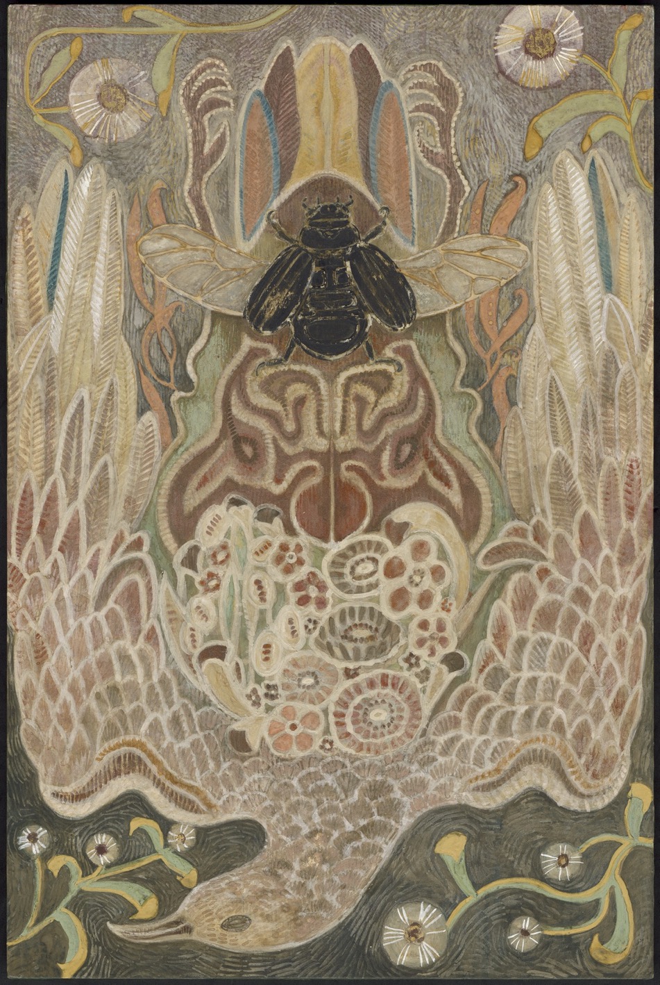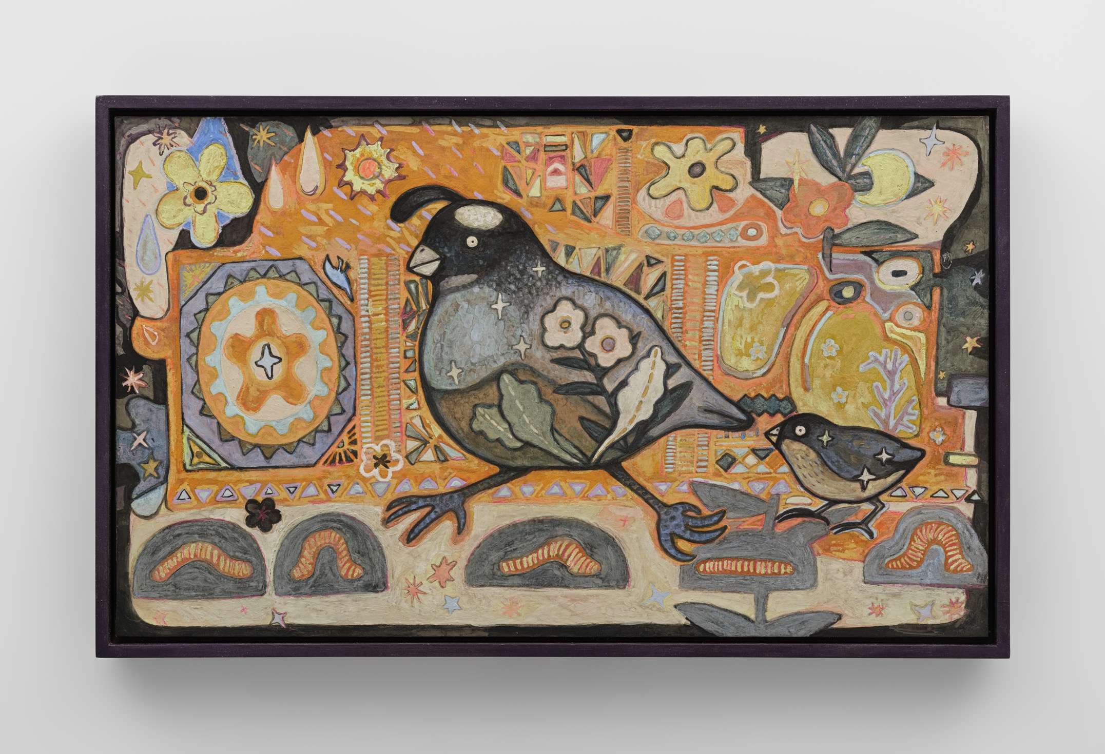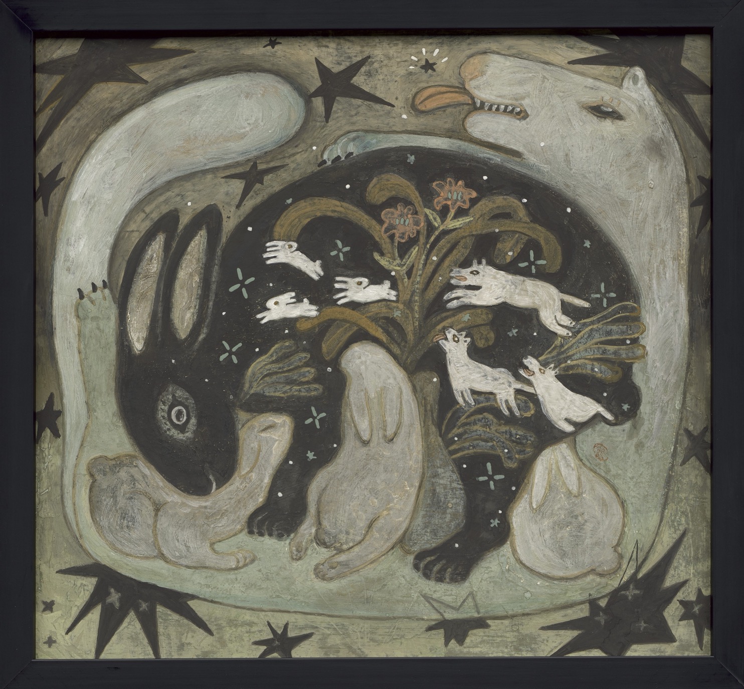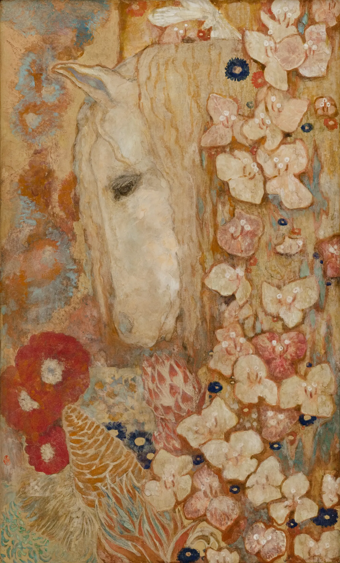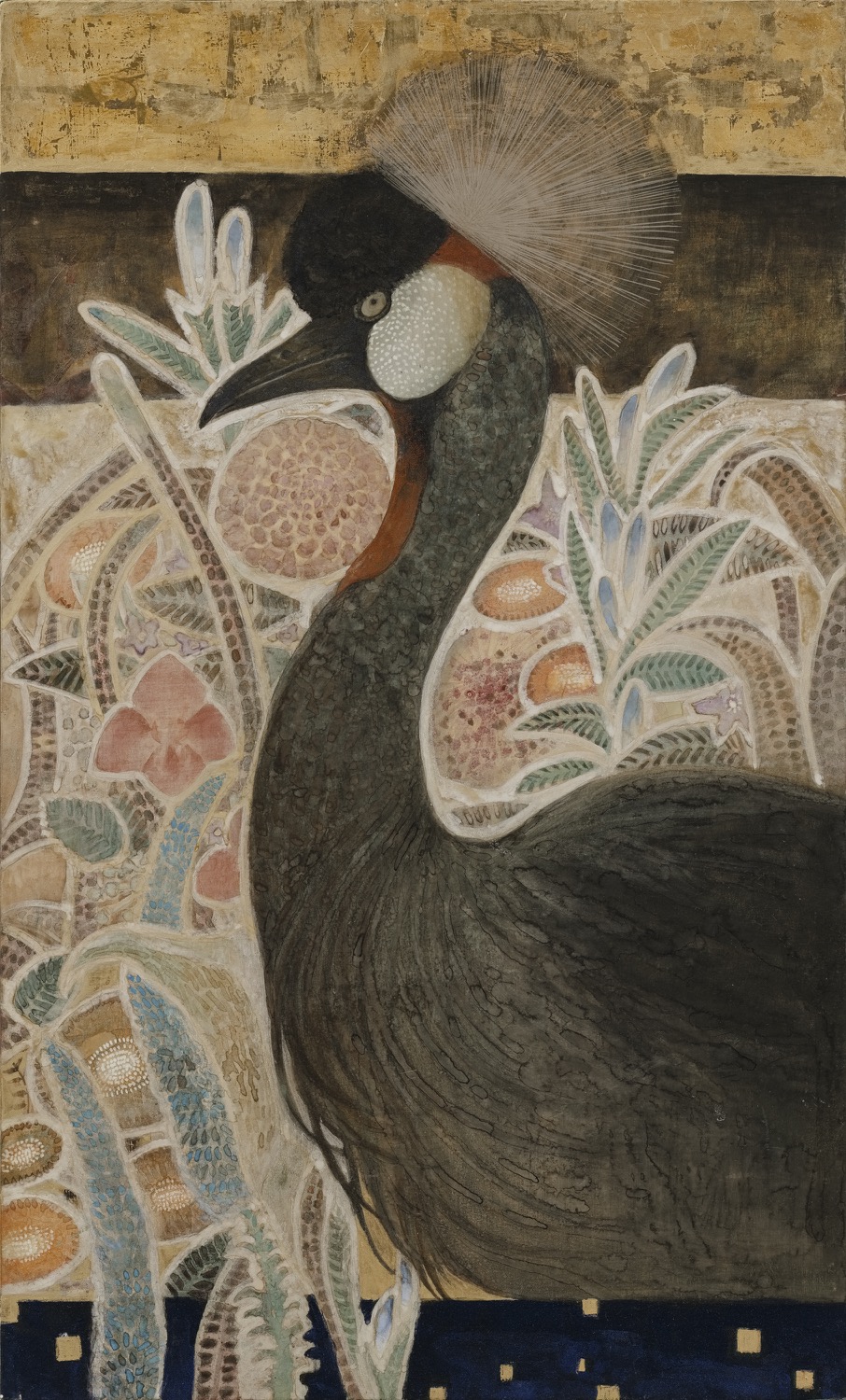 從繪畫視角到生活狀態,洪永欣除了以畫筆探討人與動物的關係,也自東、西方的裝飾藝術裡汲取養分——無論是新藝術的流動曲線、拜占庭藝術的華麗鑲嵌、或是中世紀手抄繪本的細膩工筆,在斑駁沉色的基底上,各以排列、對稱的重複性結構,交錯蔓生出旋律般的植物花草,譜出輕快或平靜、愉悅或沈緩的視覺節奏。