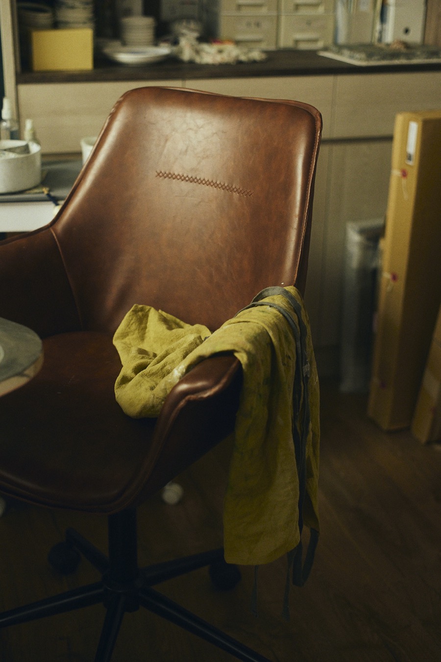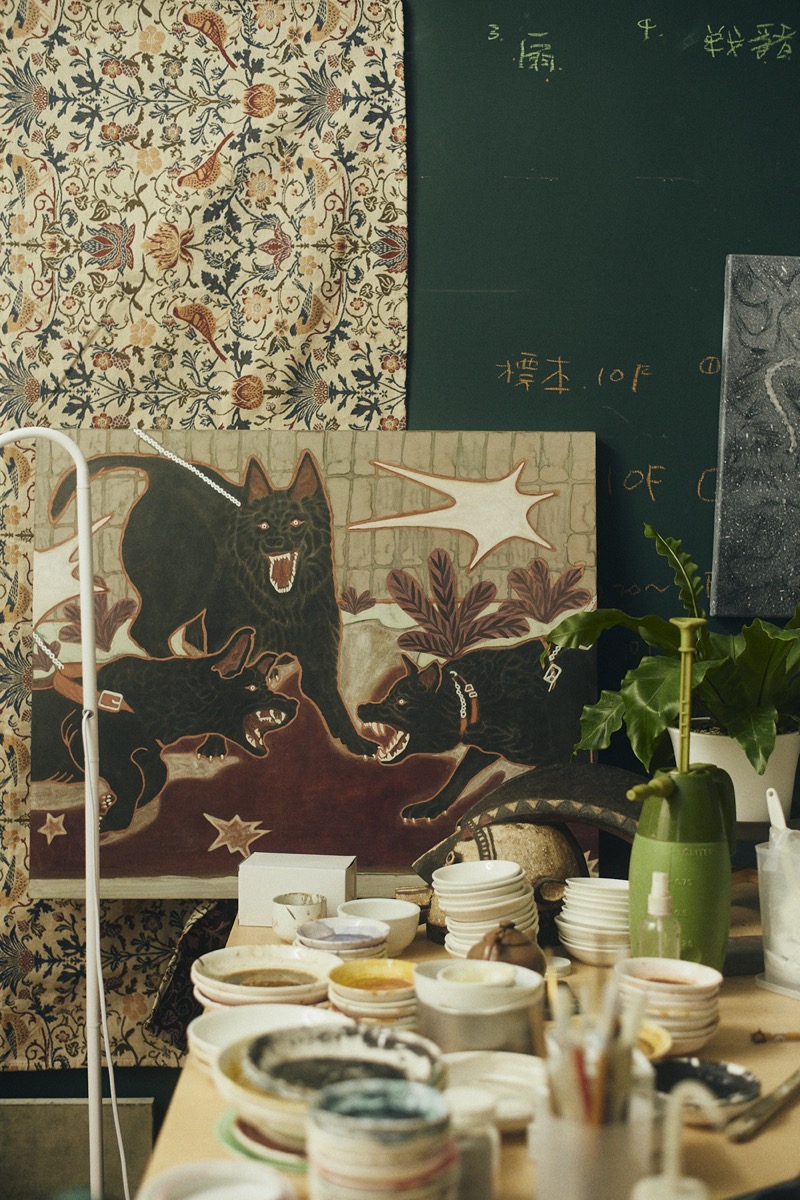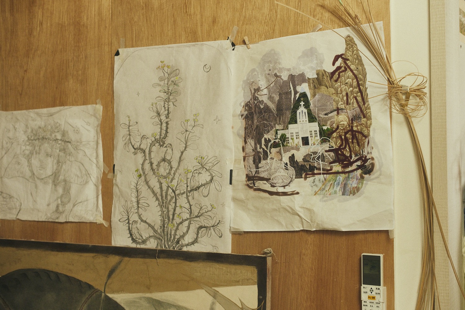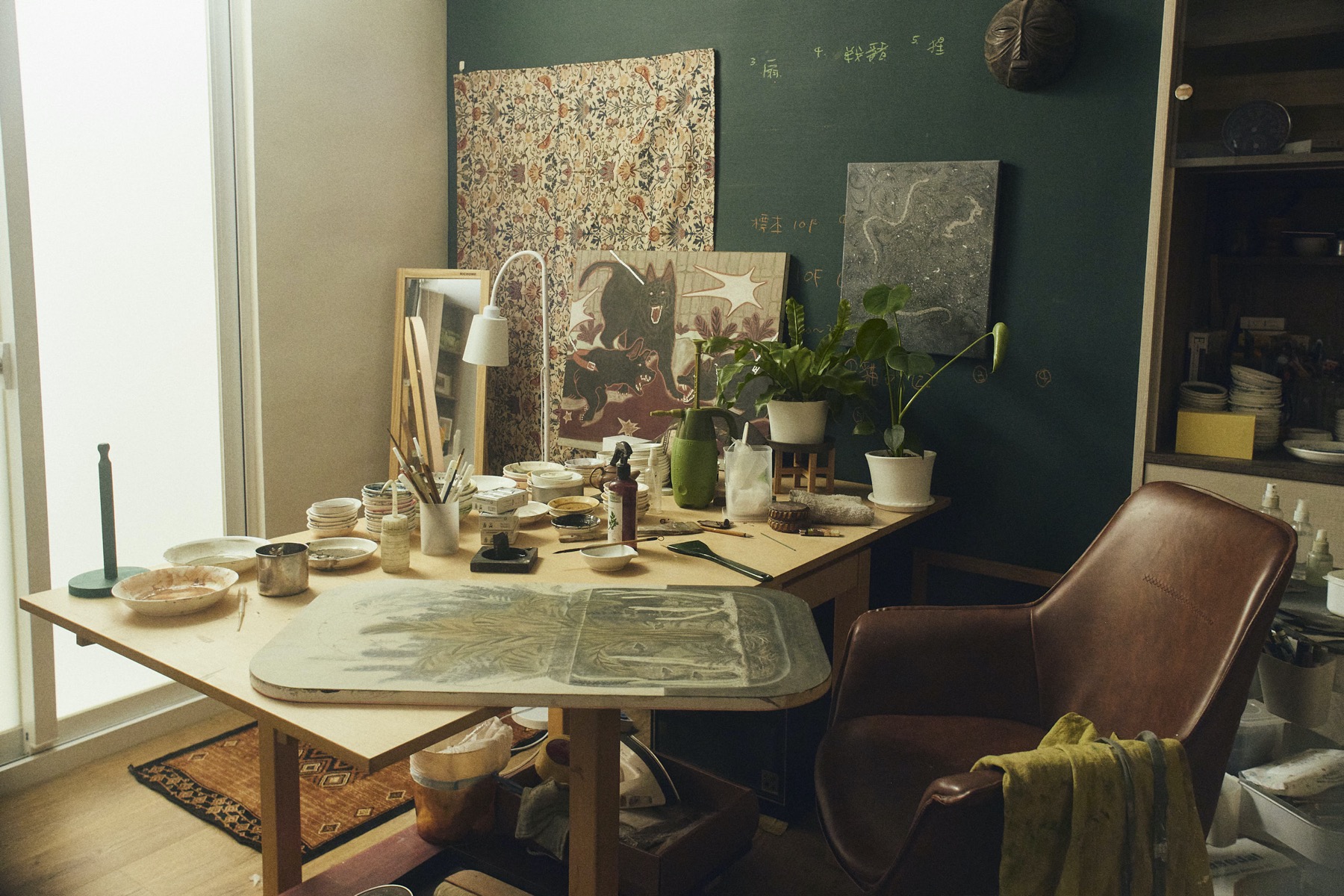 工作室陳列著創作的日常,層層前後疊放的作品互相倚靠,隨手記下的想法被謄寫在黑板牆上,纖細筆跡落於視線可見的地方——創作是撐起她生活的一座山,書籍也是。