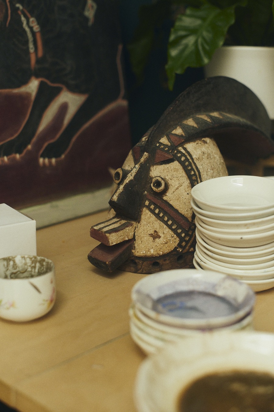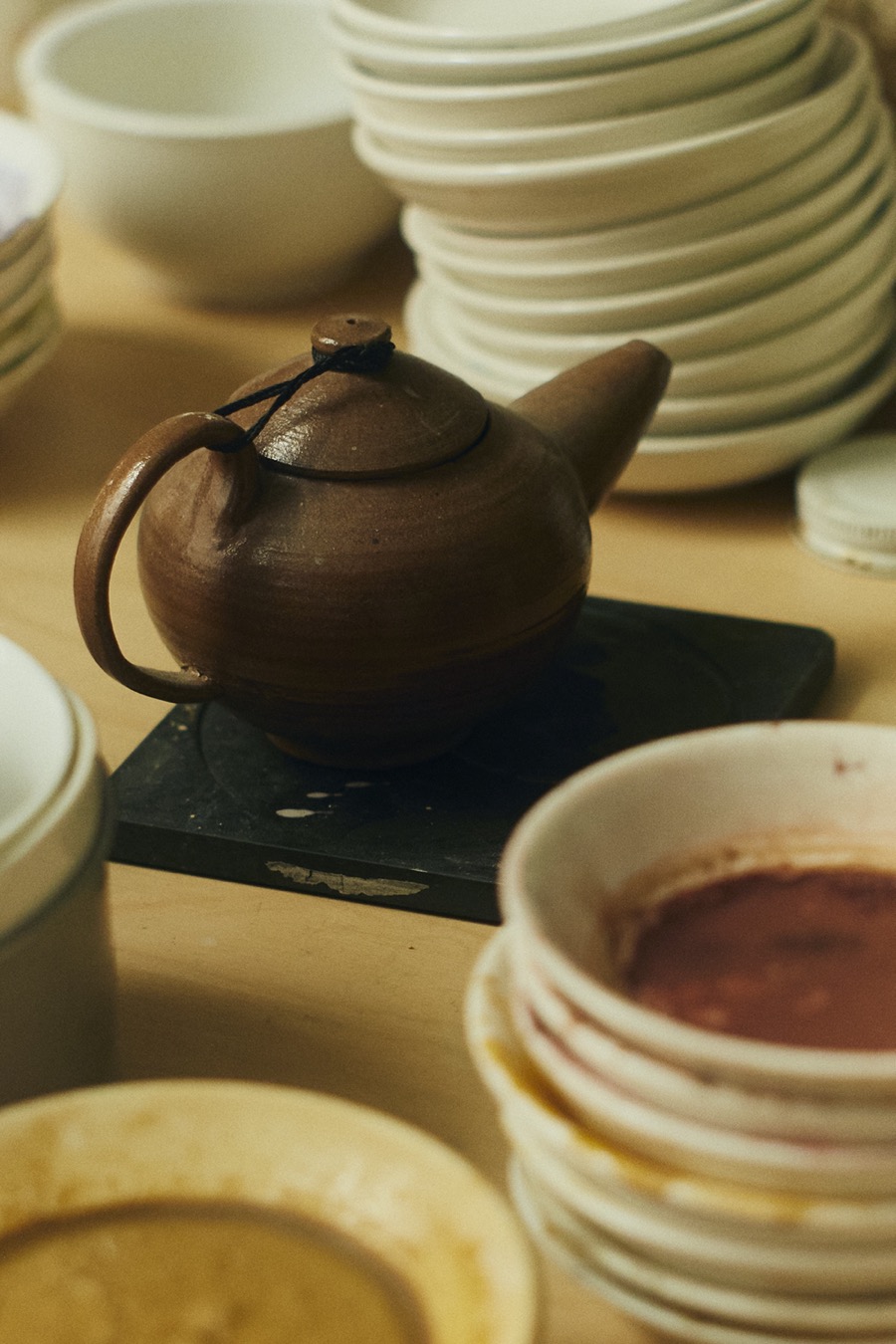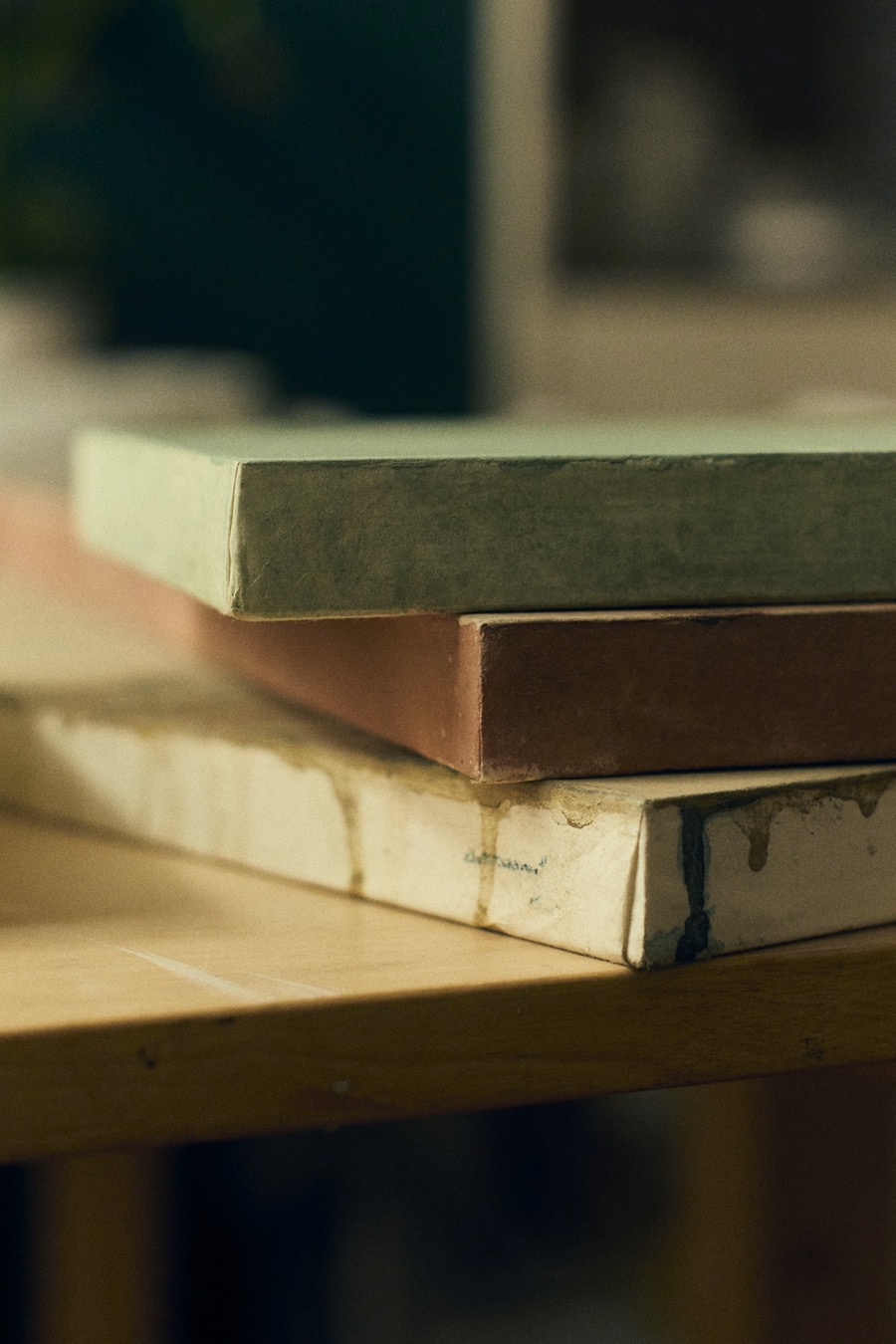 工作室陳列著創作的日常,層層前後疊放的作品互相倚靠,隨手記下的想法被謄寫在黑板牆上,纖細筆跡落於視線可見的地方——創作是撐起她生活的一座山,書籍也是。