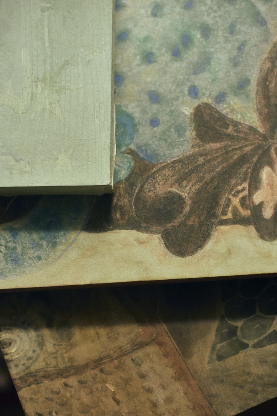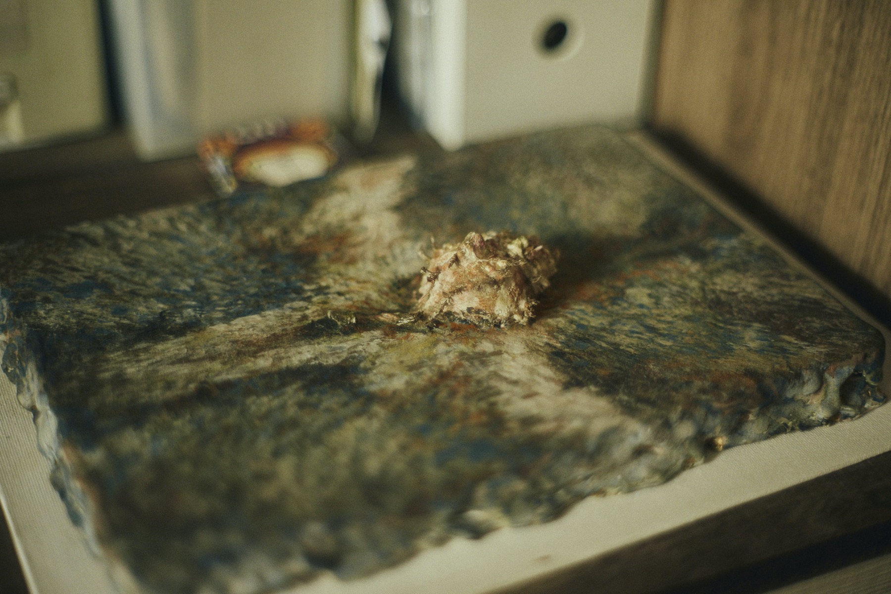 「我喜歡古代文明的斑駁感,在完全自然、毫無人為保養的環境下,隨時間風化產生的質變,讓畫作從『人工物』逐漸變為介於『人工物』和『有機物』之間的存在。」著迷於自然現象遺留的「痕跡」,她將自己置身於時間的斑駁裂隙,一筆一畫都是她對與自然關係的思索,在濃淡中蔓生出古色美感,在細節之處瞥見彷彿經濕氣與日曬浸潤後的質地。