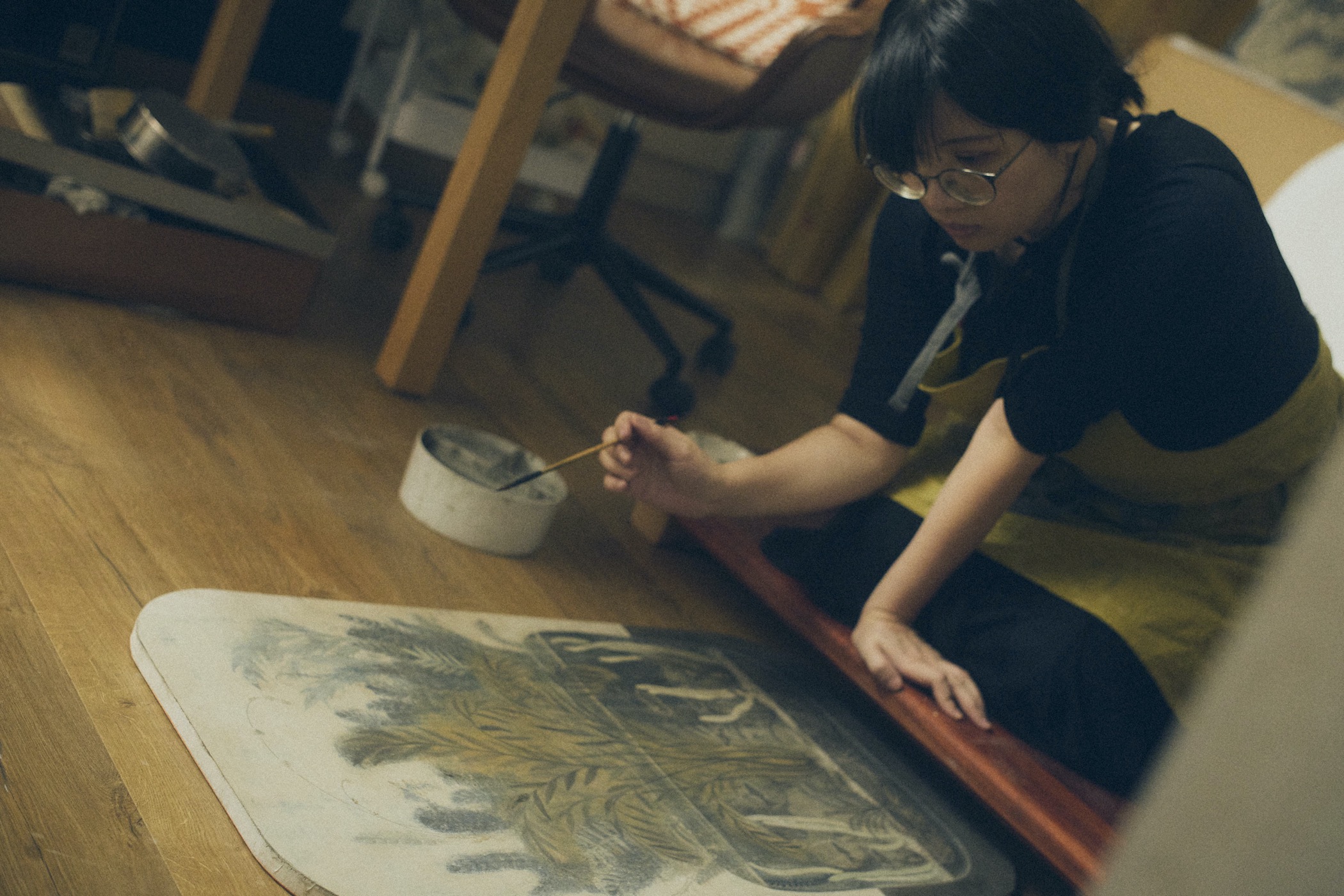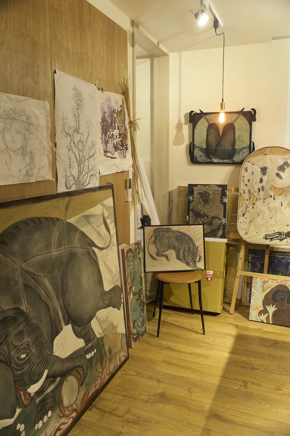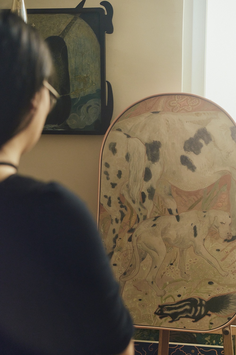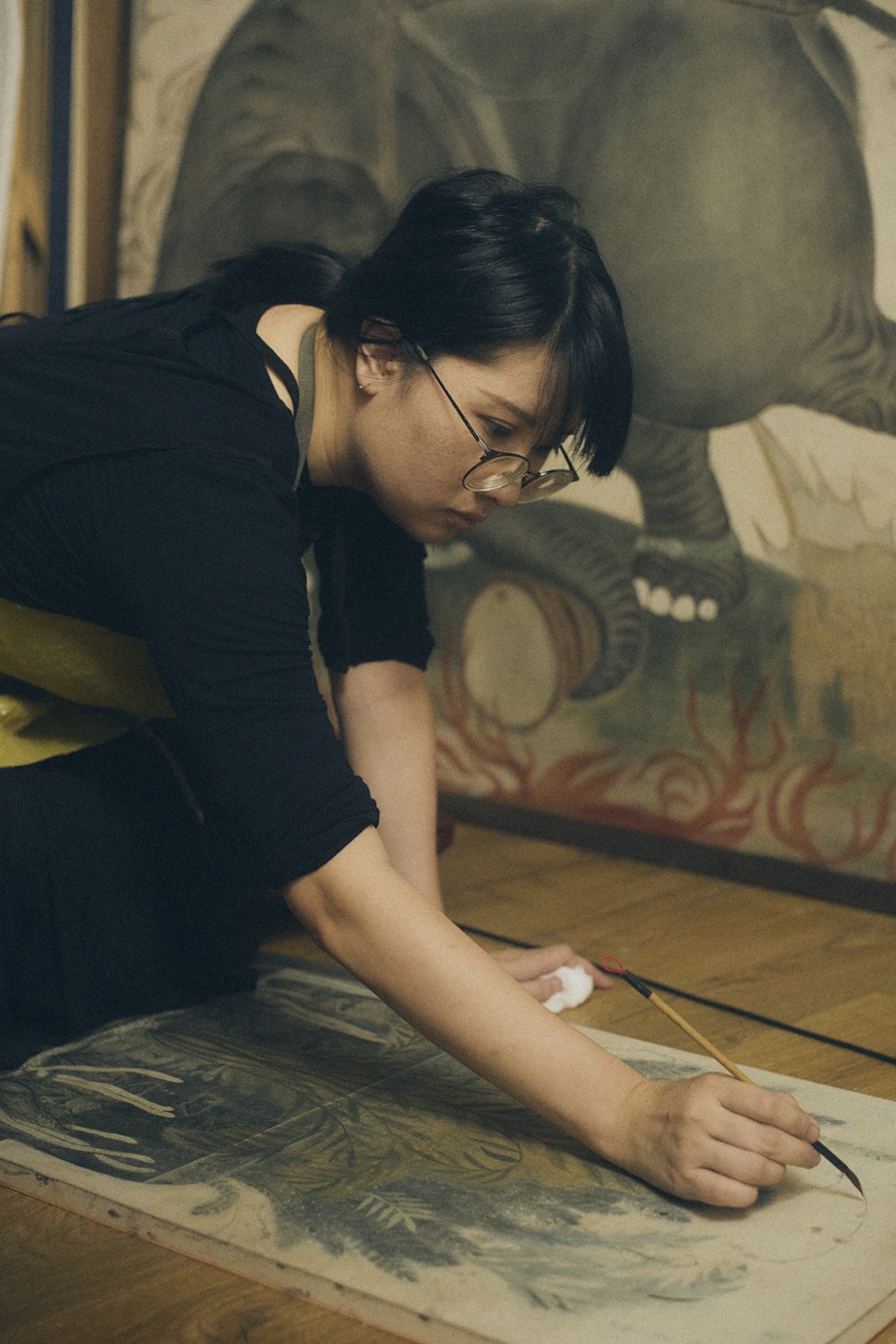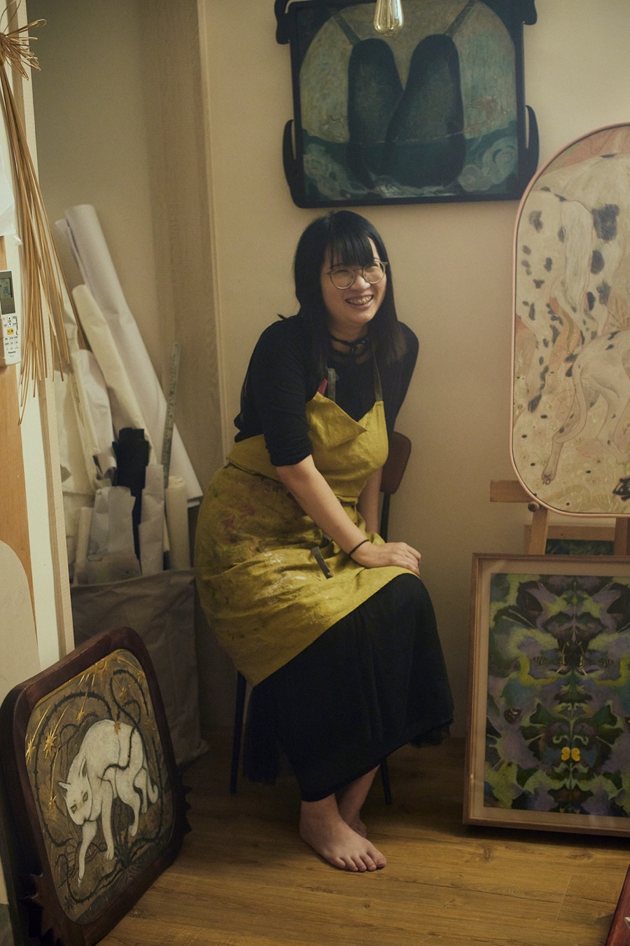 一杯熱拿鐵,點燃一根線香,習慣揉著雙眼在深夜裡一志傾注,洪永欣會盤起髮絲,從晚上九點開始創作到早晨,隨著靈感的河流,沈浸於時間的刻度。選紙,擬稿,調配礦彩,貼箔,因反覆摹寫而動,也因躊躇於畫面而靜,神情猶如作品裡的動物般,自有性情和堅定所指。