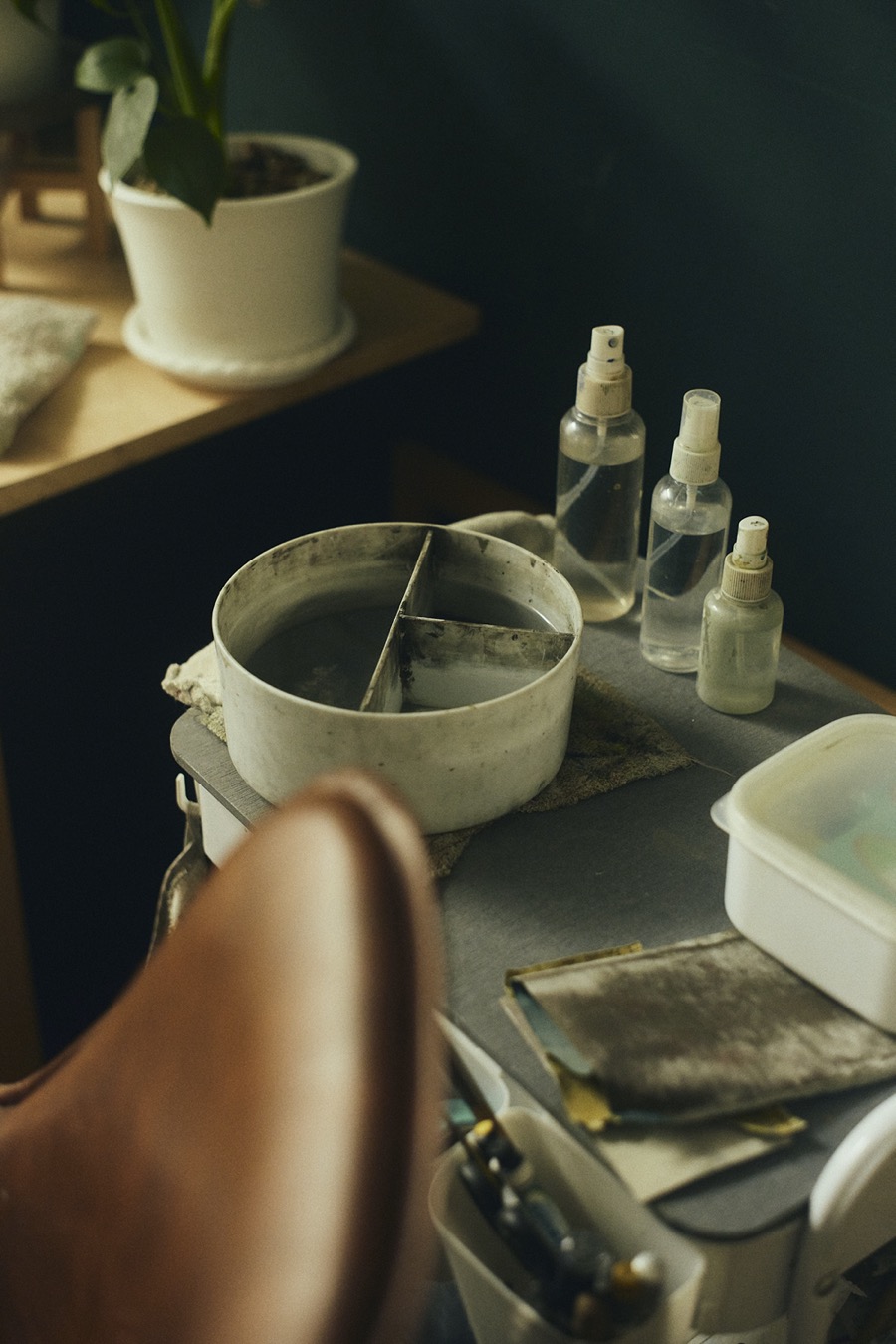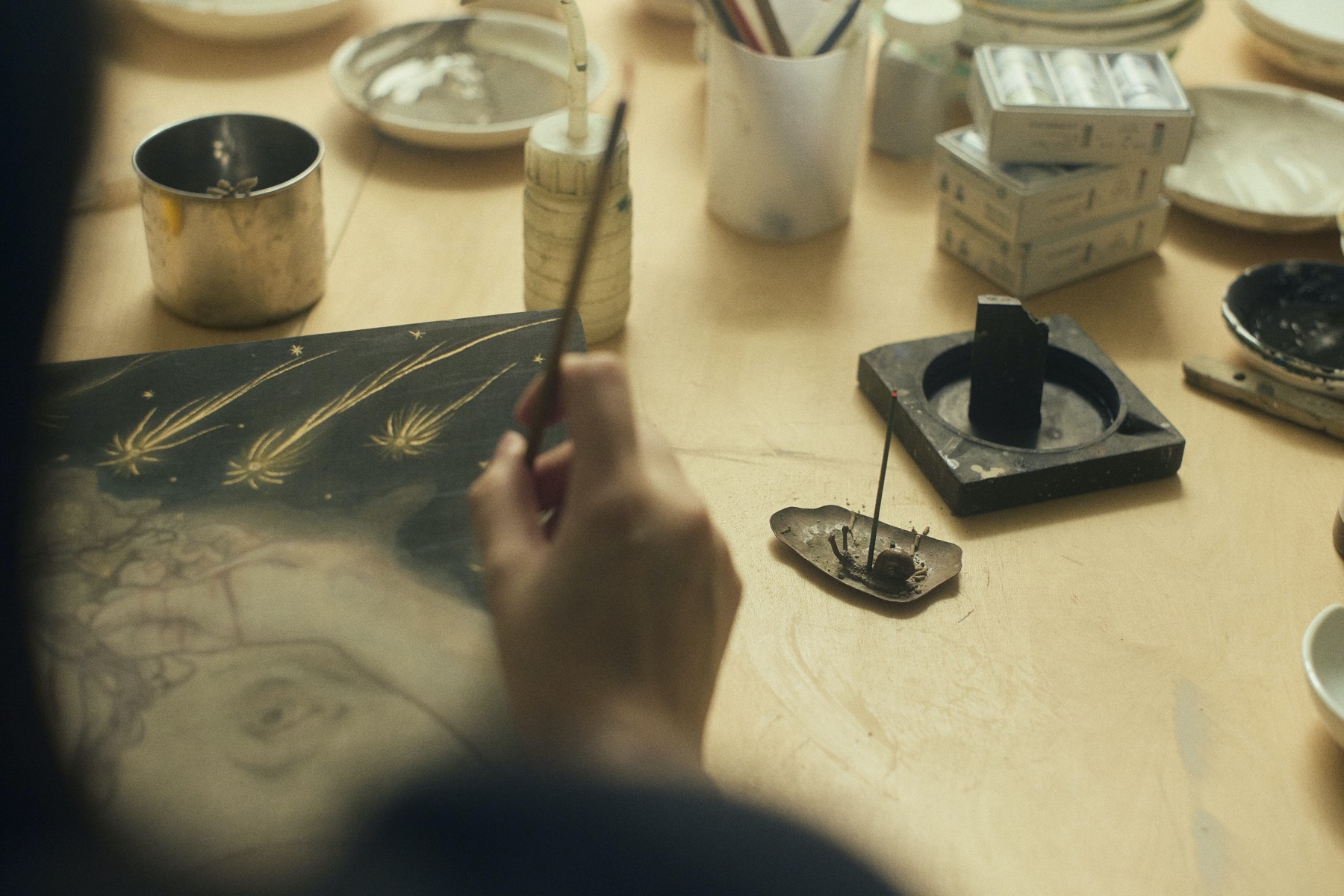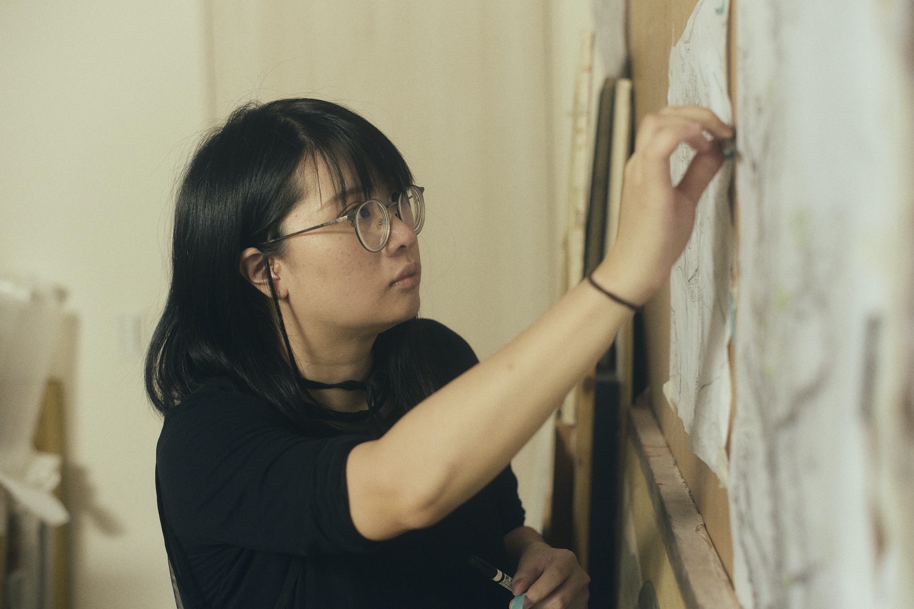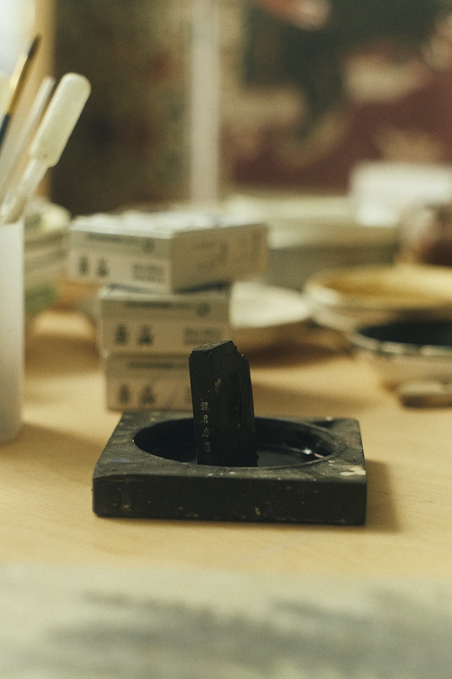 一杯熱拿鐵,點燃一根線香,習慣揉著雙眼在深夜裡一志傾注,洪永欣會盤起髮絲,從晚上九點開始創作到早晨,隨著靈感的河流,沈浸於時間的刻度。選紙,擬稿,調配礦彩,貼箔,因反覆摹寫而動,也因躊躇於畫面而靜,神情猶如作品裡的動物般,自有性情和堅定所指。