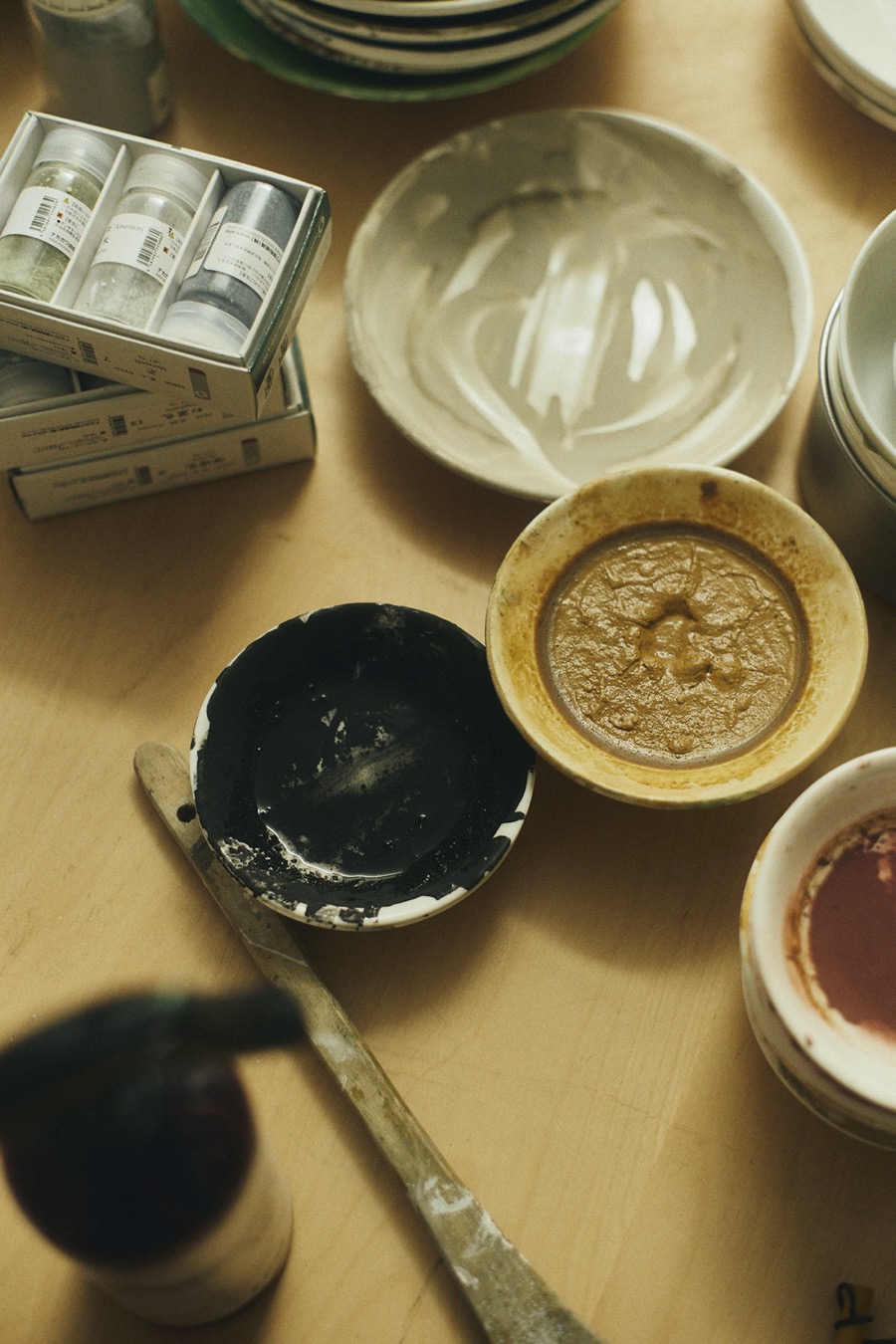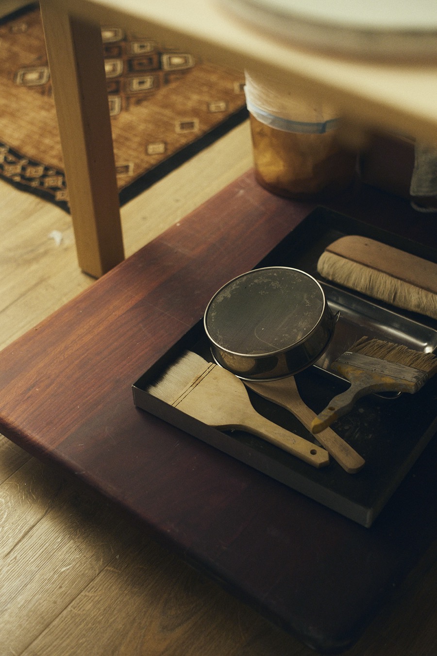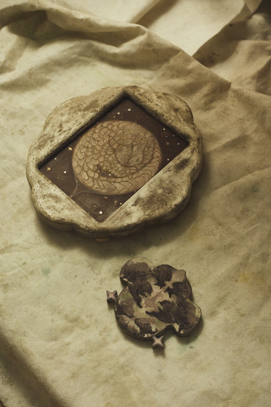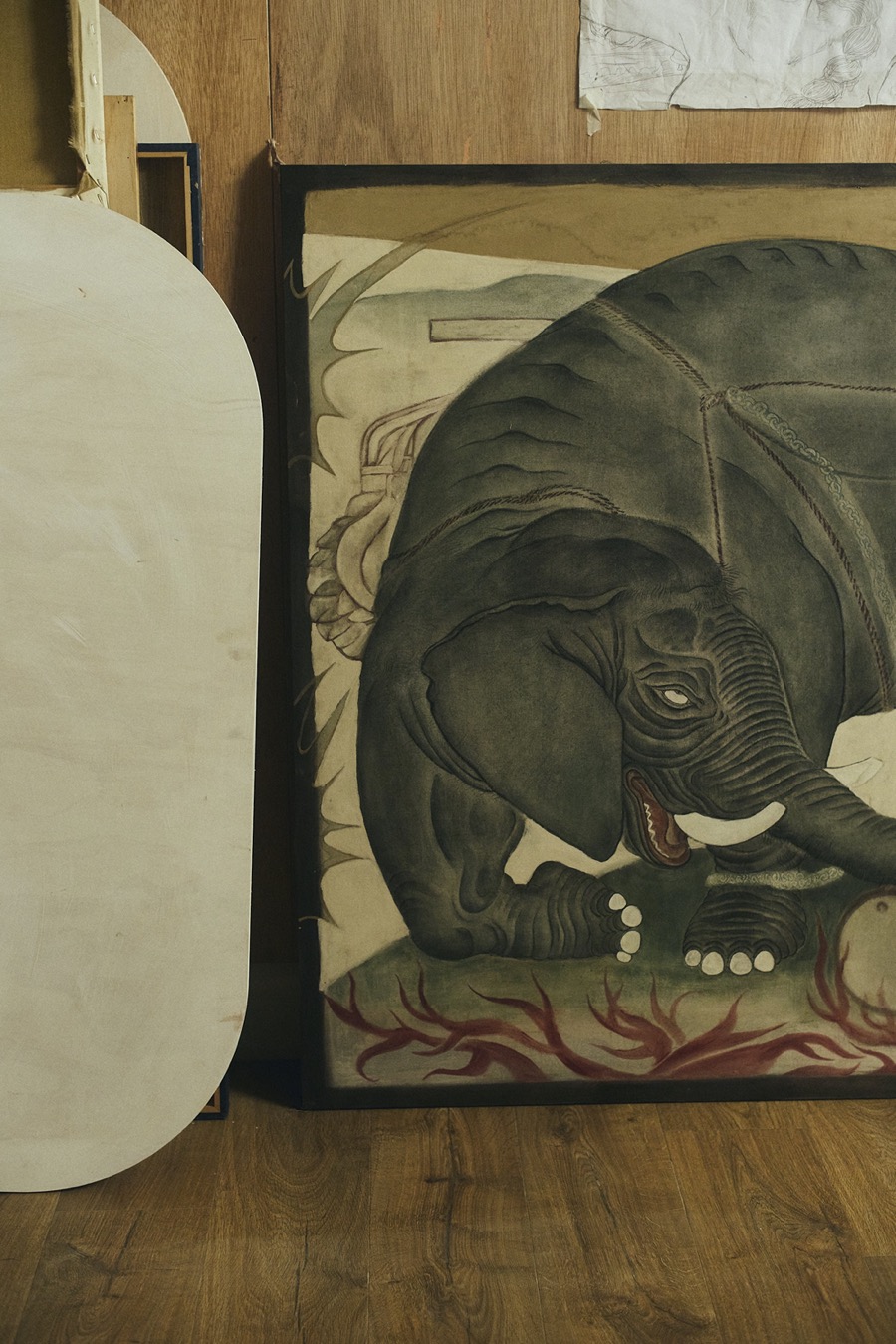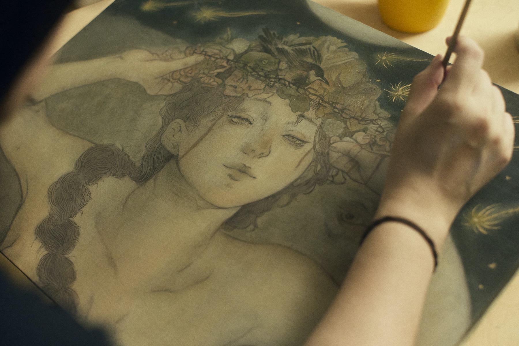一杯熱拿鐵,點燃一根線香,習慣揉著雙眼在深夜裡一志傾注,洪永欣會盤起髮絲,從晚上九點開始創作到早晨,隨著靈感的河流,沈浸於時間的刻度。選紙,擬稿,調配礦彩,貼箔,因反覆摹寫而動,也因躊躇於畫面而靜,神情猶如作品裡的動物般,自有性情和堅定所指。
