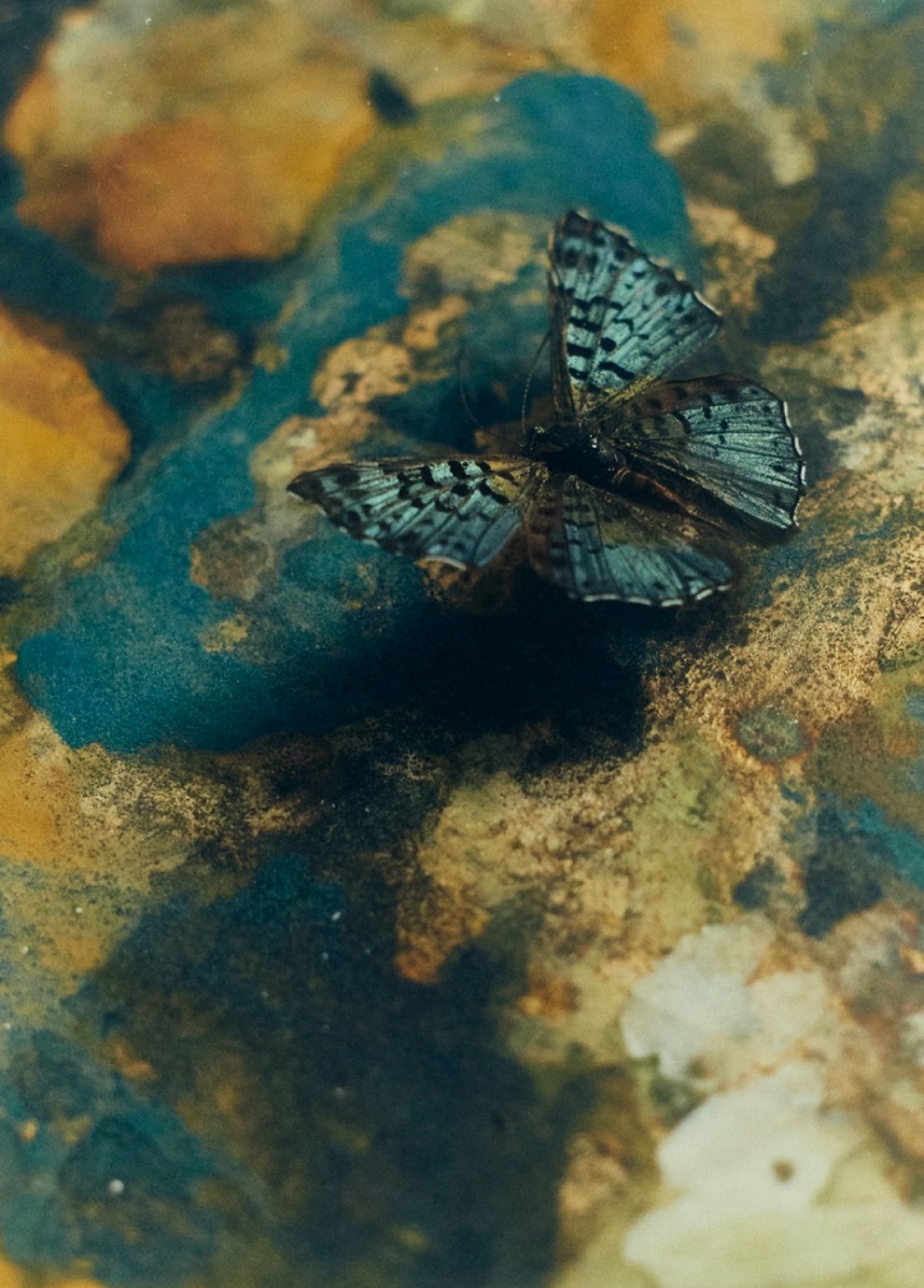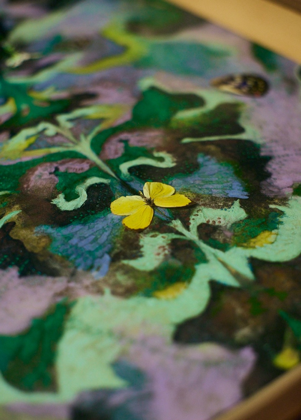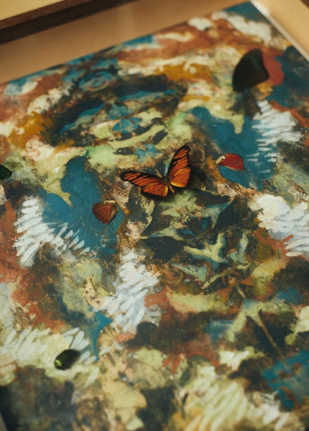墨漬圖樣宛如自行有機生長,靜置的翅膀呼應對稱又具流動感的構圖,彷彿再次擁有一次生動翩然。這些不具象的元素,巧妙引導觀者不去辨認圖像、不去思考為什麼要這樣畫、不去推敲作品是否具有「意義」。當繪畫詮釋的說明性減少,觀者便能專注回「美」本身,無論那是色澤暈染裡的一片殘缺羽翅,或是隨時間流動閃爍的鱗粉光澤,卻依舊開放每個人介入、參與、想像,在任何一種詮釋和理解中都成立。