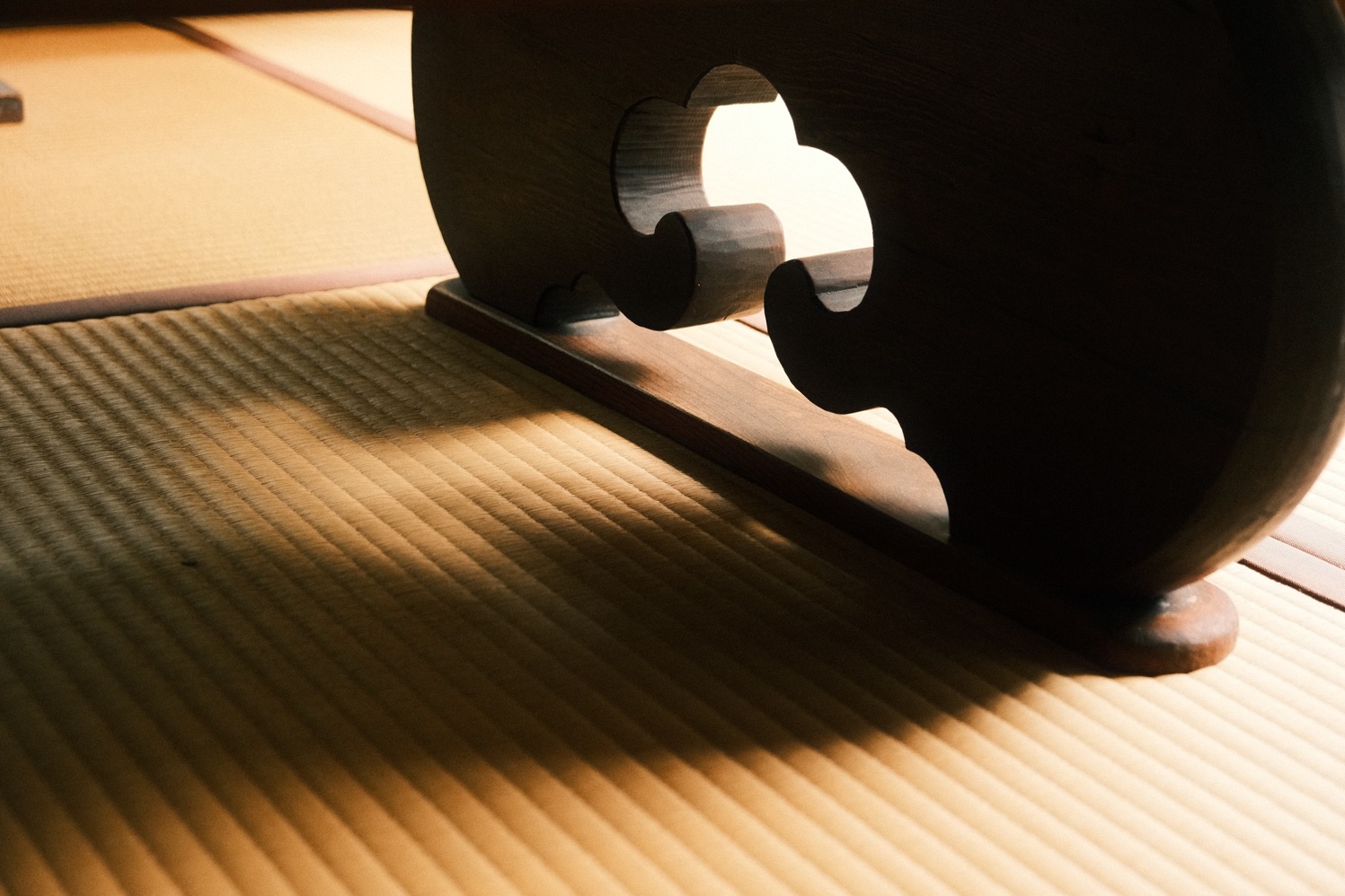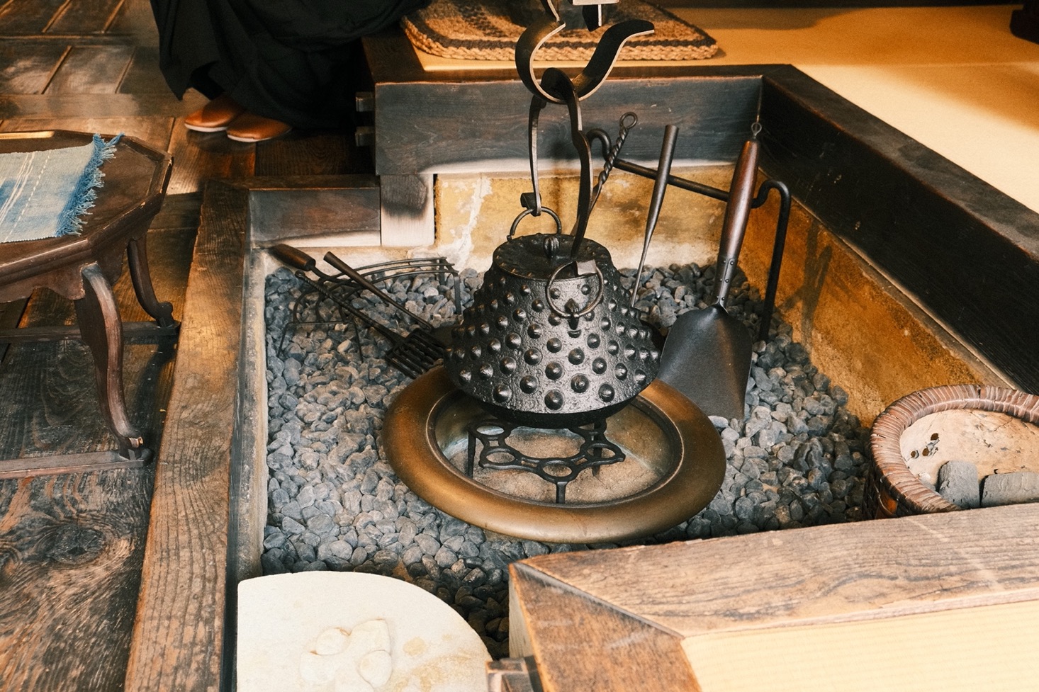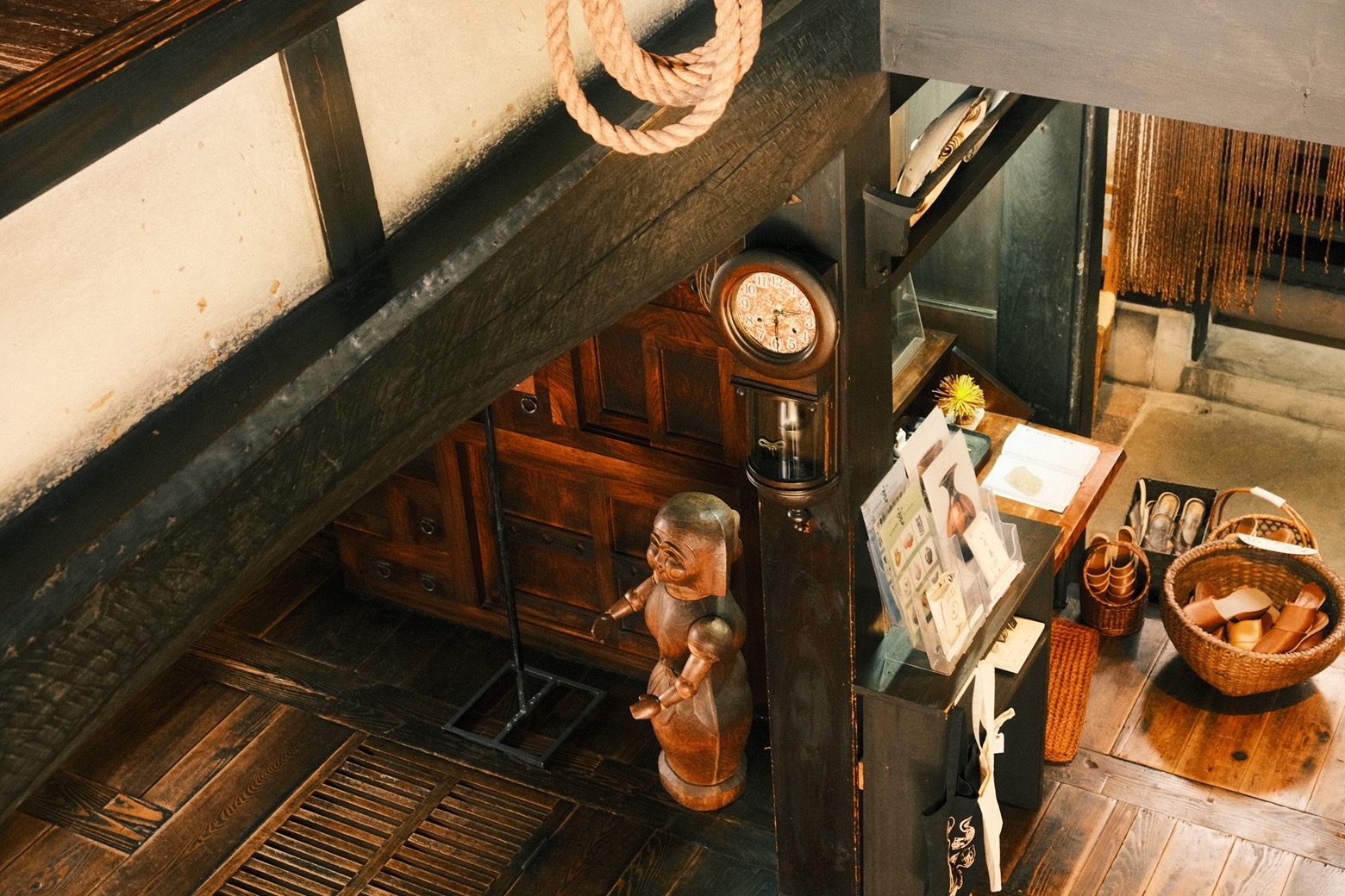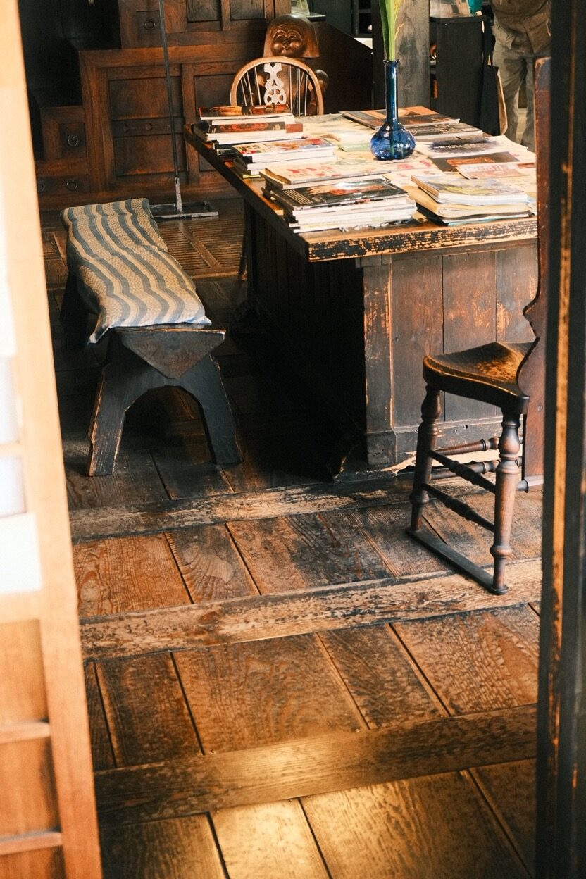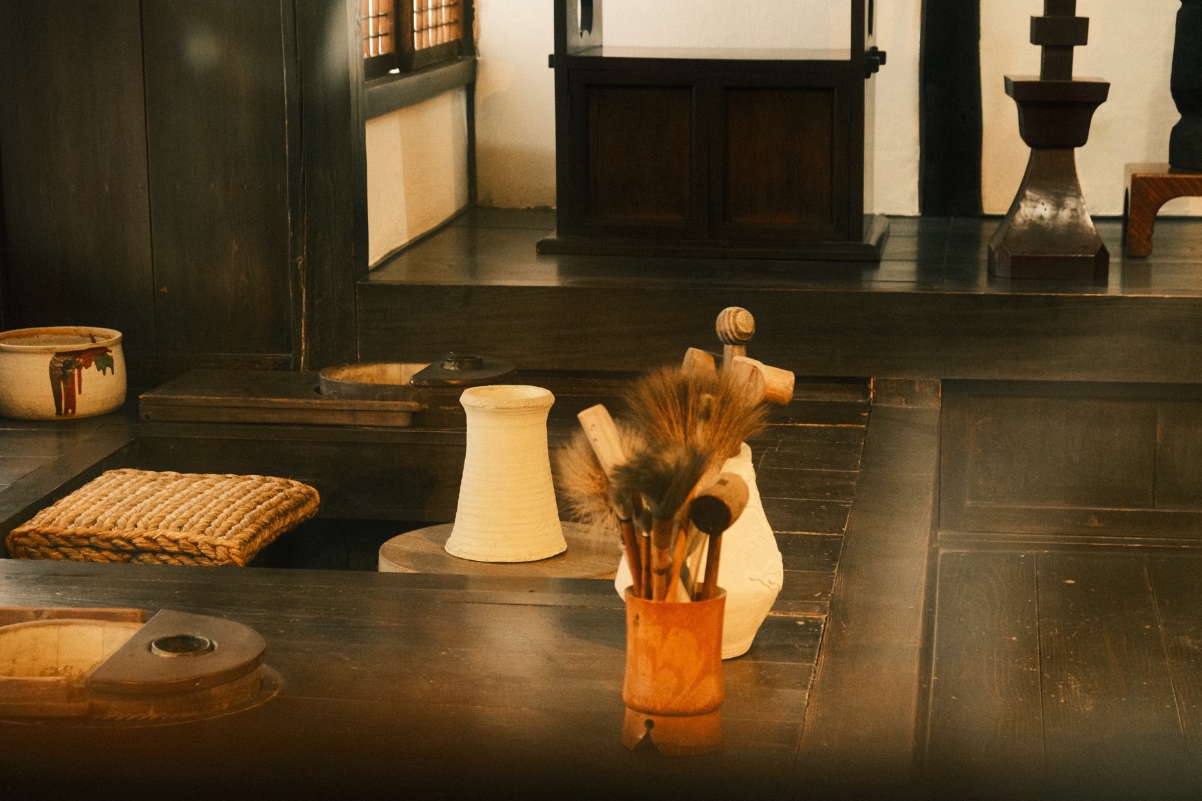 腳下的碎光滾出圓潤聲響,穿過長廊,便是河井於 1937 年親自設計,並和克紹箕裘的建築師兄弟攜手砌築的家屋。幾張桶狀藤椅環繞著圍爐,早來的遊客坐著翻書的憨厚矮凳,前身是搗米用的舊木杵;至交柳宗悅當年在新居落成時所贈的時鐘,就在入門後絕對不會忽略的厚實立柱上悠然擺盪。素材和人的產能或許有限,但靈感無垠,沒有任何一件透露出機械複製品的印記。