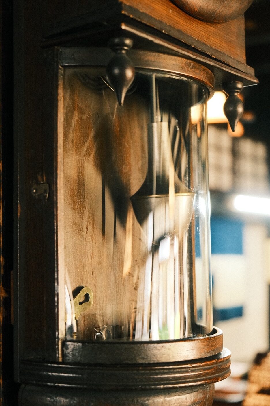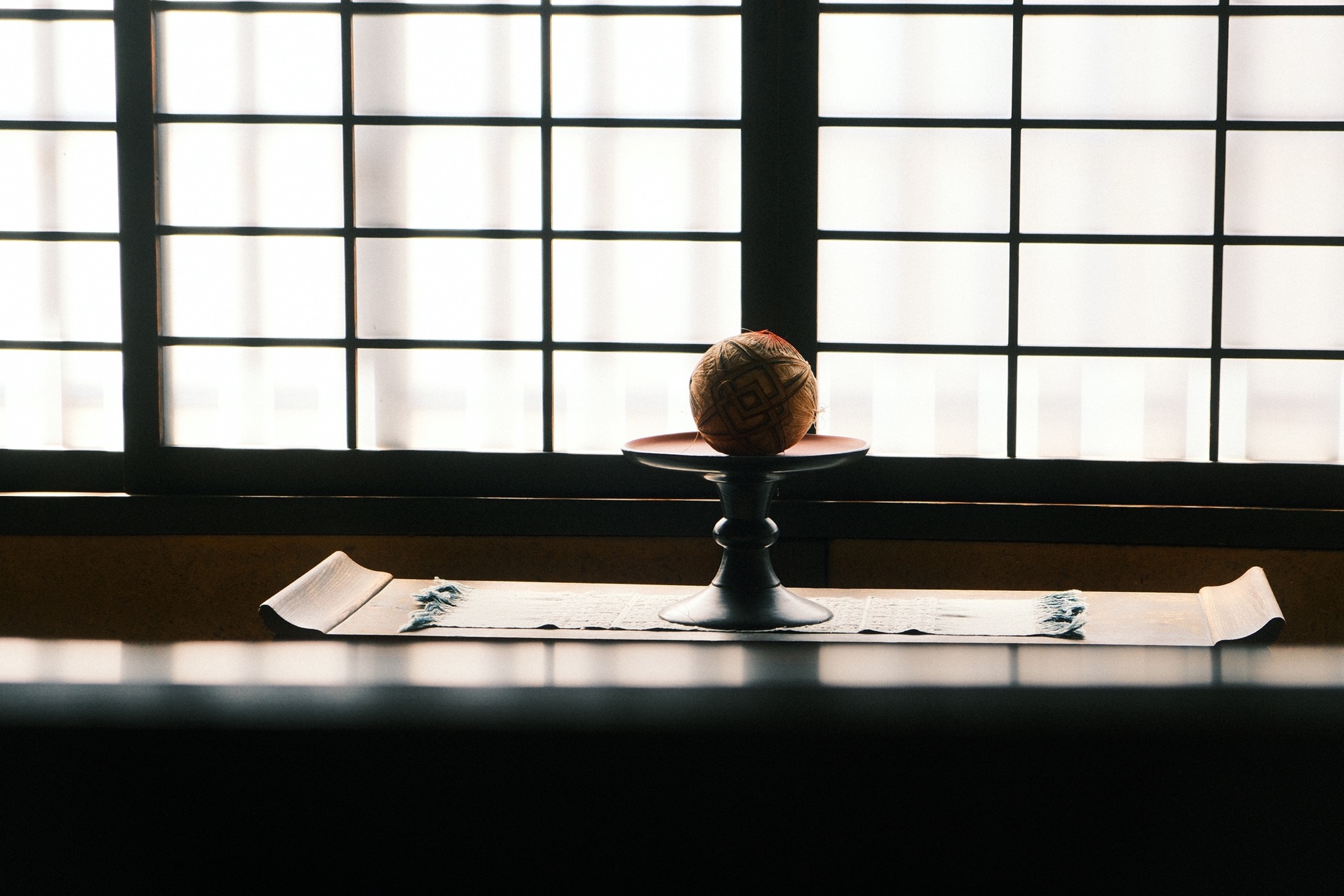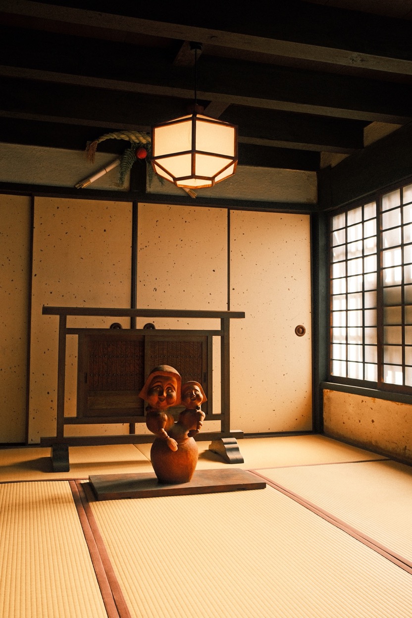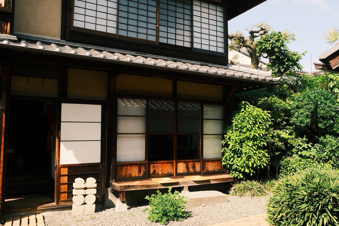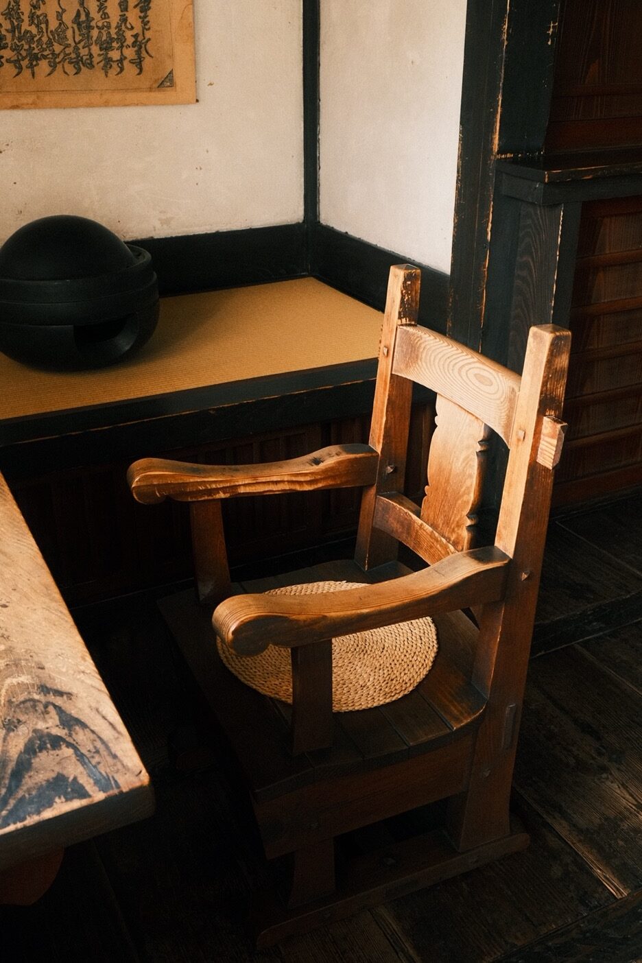 腳下的碎光滾出圓潤聲響,穿過長廊,便是河井於 1937 年親自設計,並和克紹箕裘的建築師兄弟攜手砌築的家屋。幾張桶狀藤椅環繞著圍爐,早來的遊客坐著翻書的憨厚矮凳,前身是搗米用的舊木杵;至交柳宗悅當年在新居落成時所贈的時鐘,就在入門後絕對不會忽略的厚實立柱上悠然擺盪。素材和人的產能或許有限,但靈感無垠,沒有任何一件透露出機械複製品的印記。