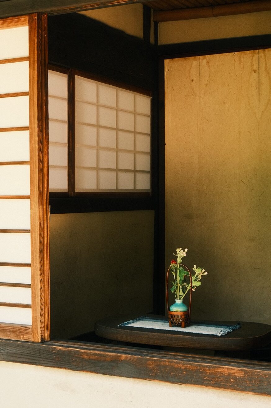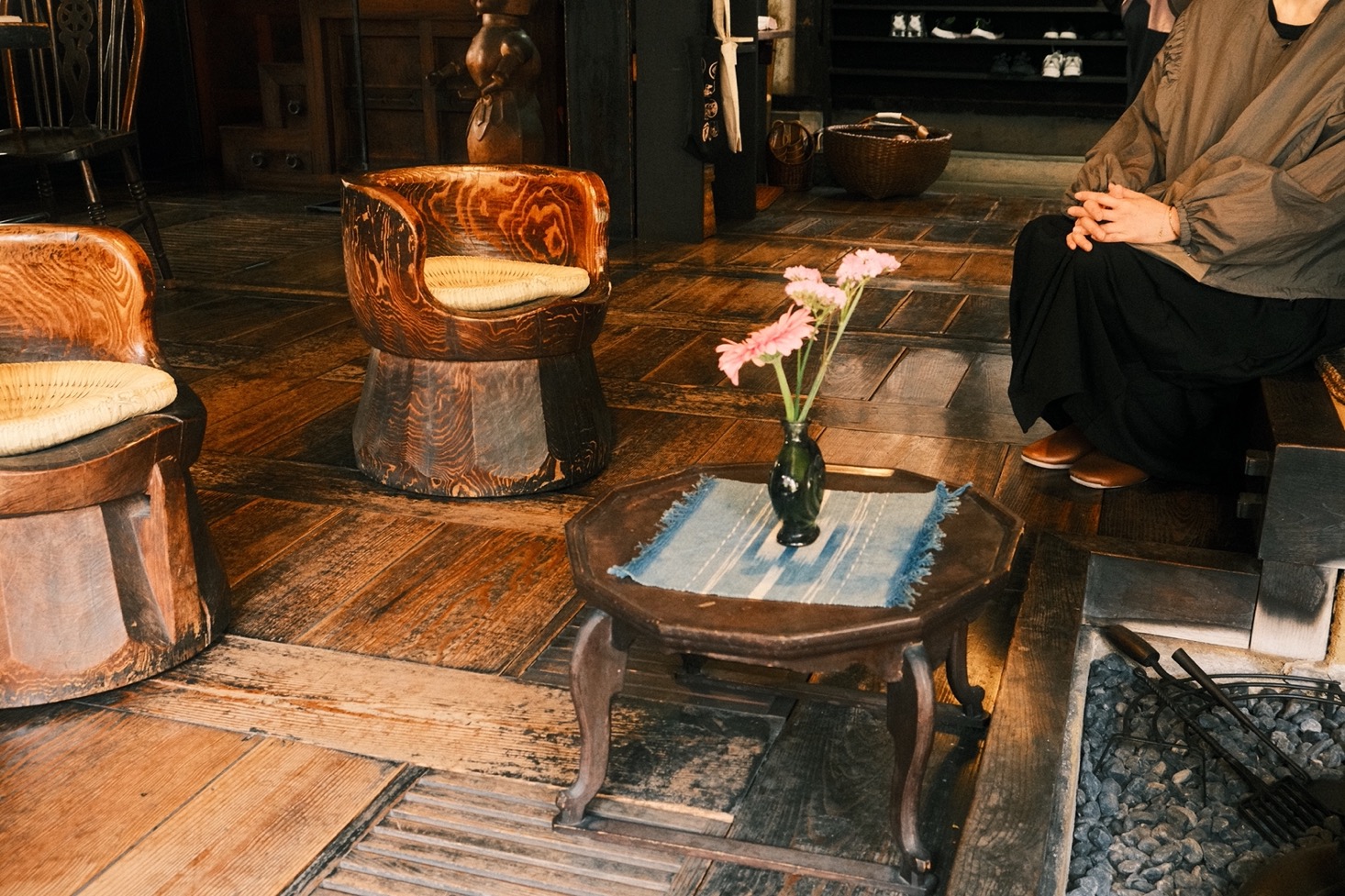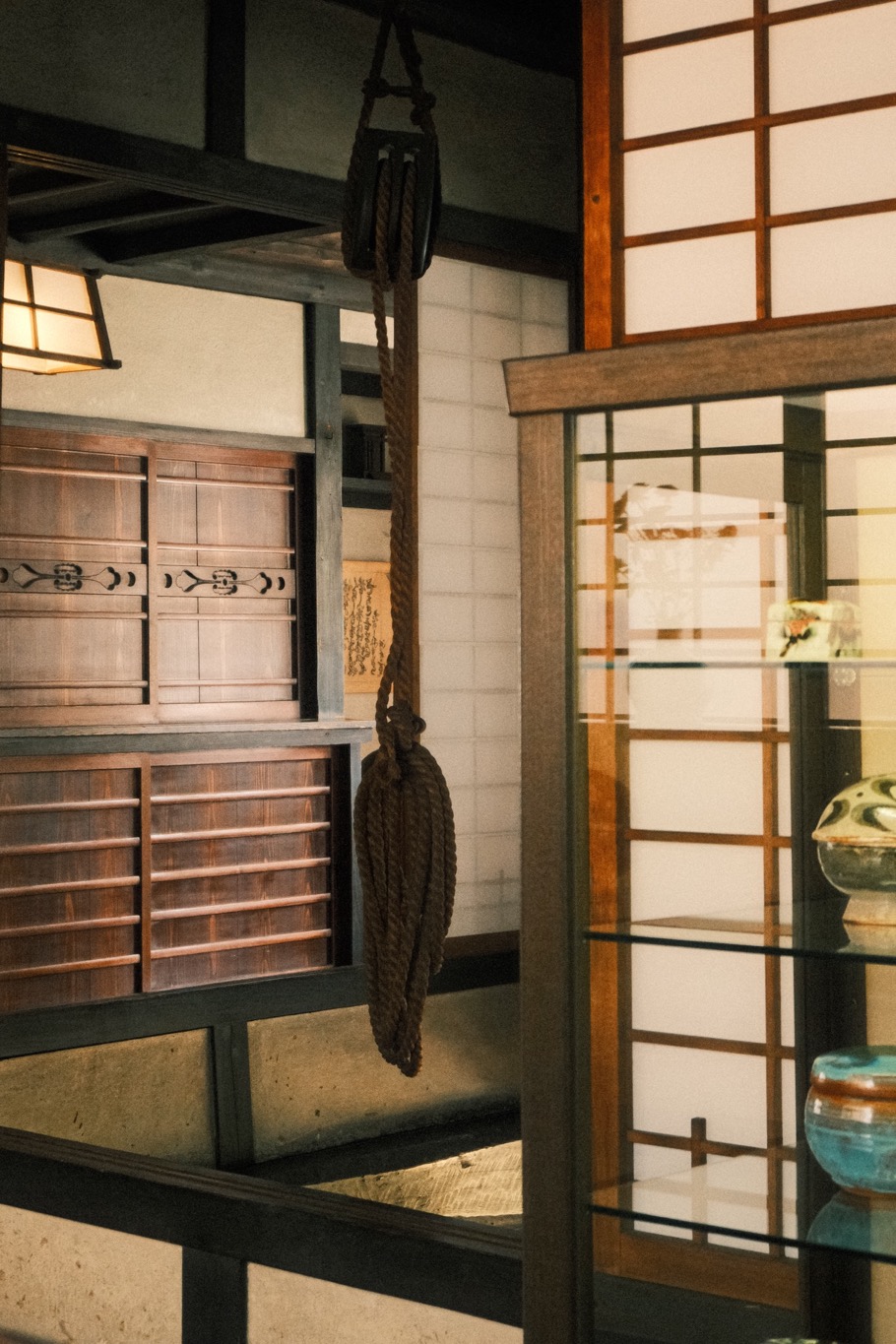 視線順著從二樓垂降的鍋釜往上溜去,目光蕩漾處,被庭院拂來的花草風影溶成一片繽紛光景。竹編置物籃、和紙燈籠、花瓶的有機輪廓、茶碗釉藥蔓延的裂隙、黑黝黝原木雕成的待客桌,乃至上頭的草織坐墊……滿室物件擺得隨興,卻感受不到一絲企圖奪目的言外之意,只有河井許諾生活的溫度猶存——在這全然陌生的空間,訪客與其說是「參觀」,「作客」或許更貼切,有那麼一瞬間甚至興起回到家的錯覺。