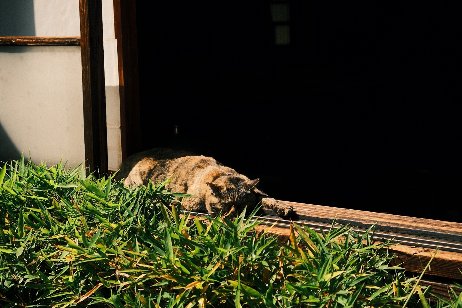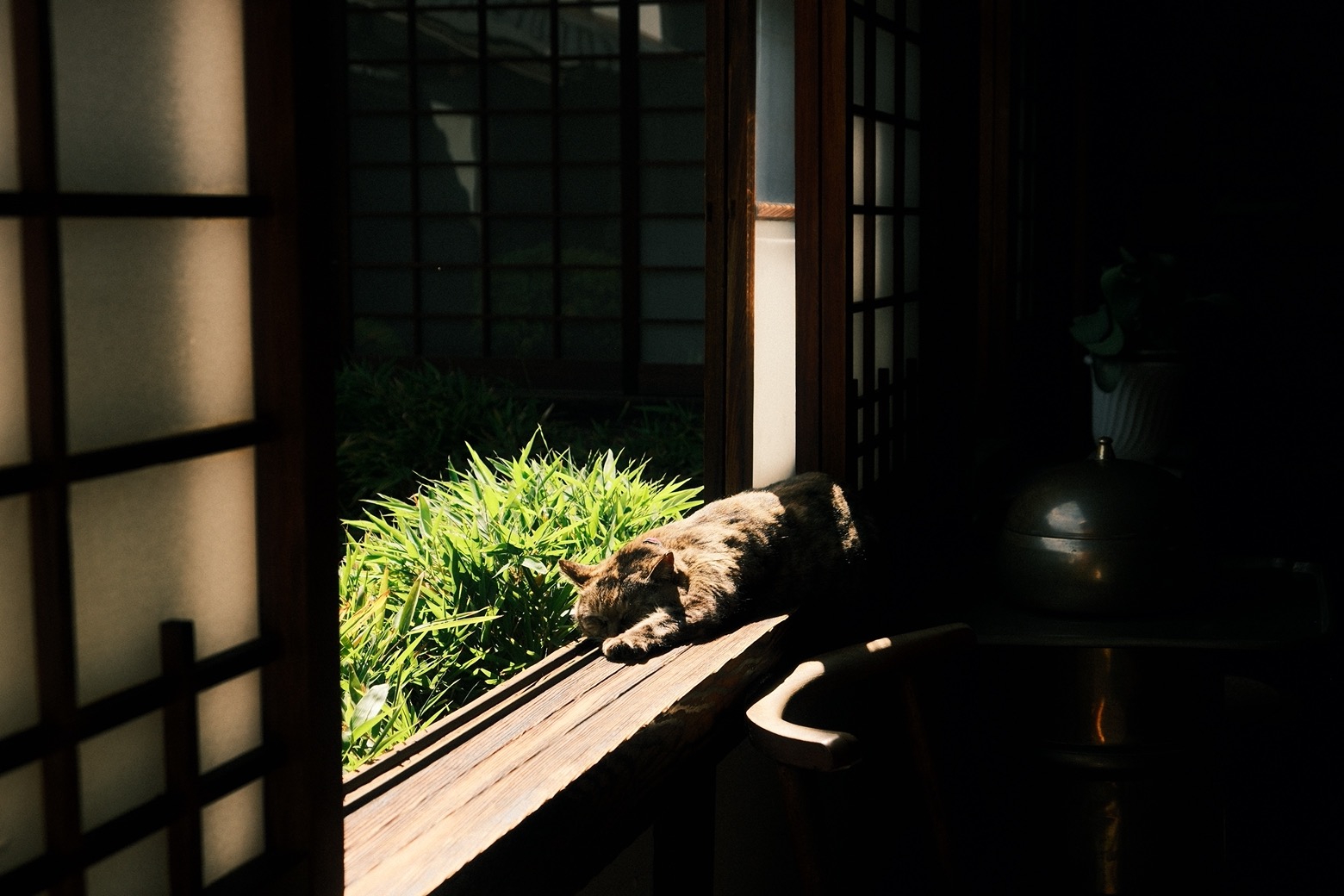 在反覆進出庭院,試坐完無數張造型殊異的木椅,繞著峰峰相連的巨窯嘖嘖稱奇,將紀念館內外每處角落,當成機關精巧的寶盒端詳把玩後,最終人們多半會黏在毛茸茸的えき旁,翻書、合照,迎風閉上雙眼、沉澱思緒。京都的晴光依舊氾濫,錯過幾場也無妨,日曬下打著呼嚕酣睡的小貓,一身斑駁的柔毛宛如河井理念的化身,那些對圓與缺、豐美與侘寂的纖細理解恆常在此,招呼著每一個來此和民藝神交的舊雨新知。