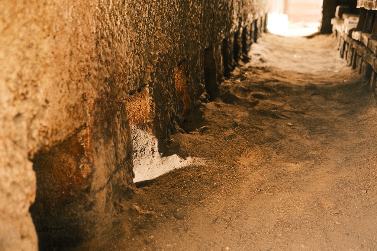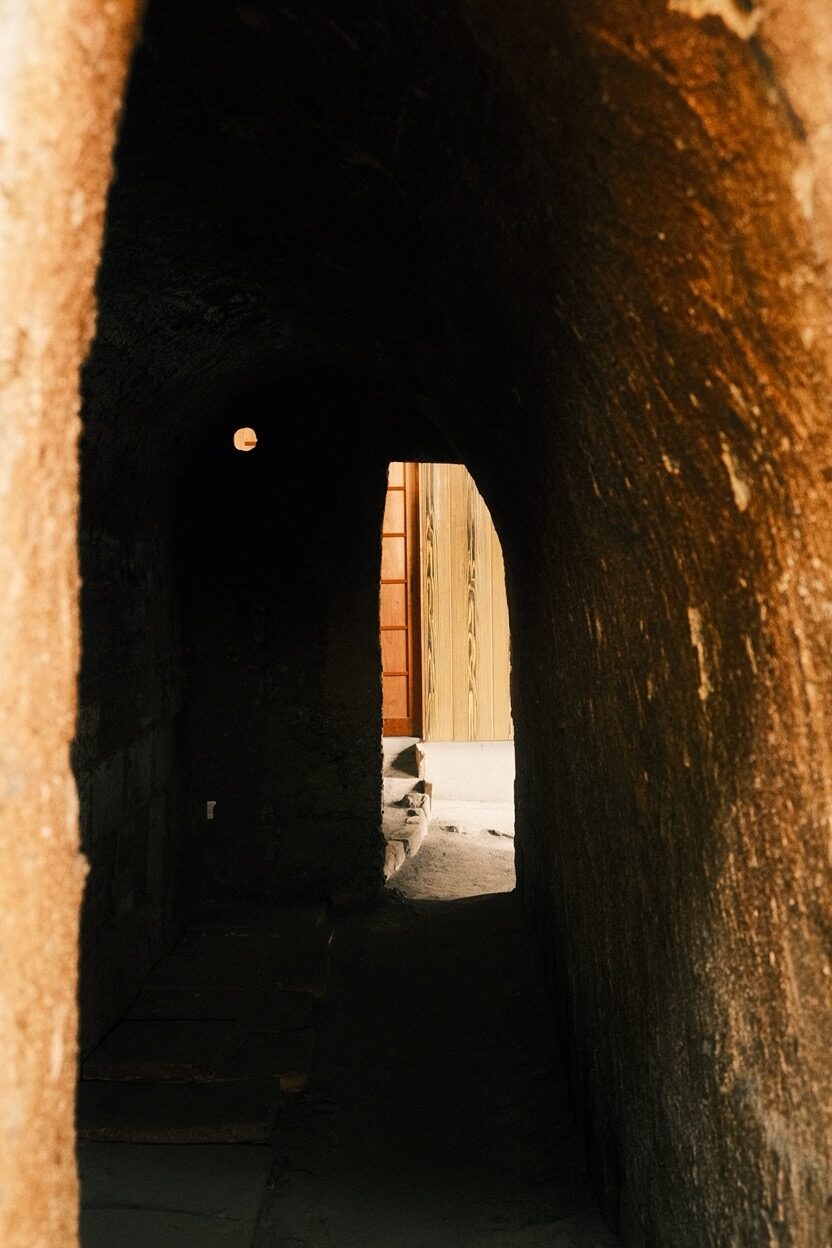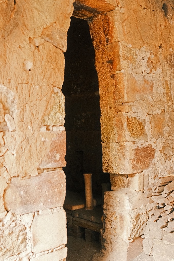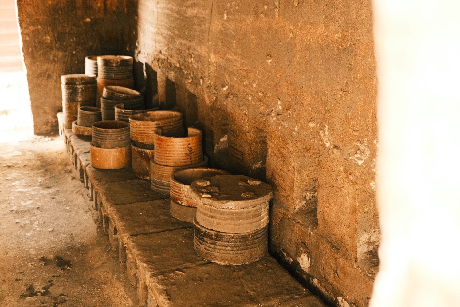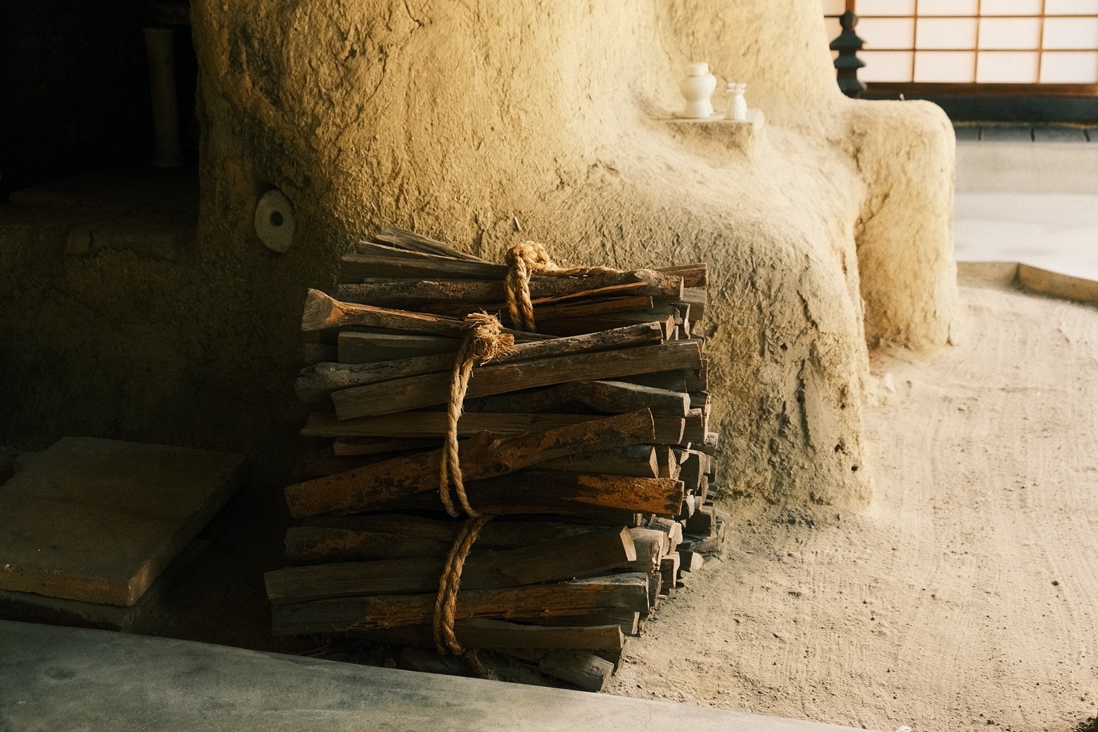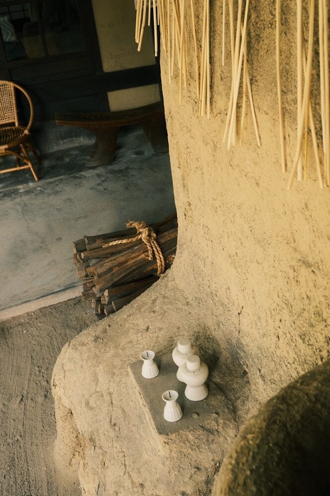 和這方空間相處時,適合以風光的方位感受路徑。戶外一座層層堆疊磚塊、表面塗抹泥土後夯成的小素燒窯,蓄積在圓潤弧度下的力量飽滿無窮;在入窯前,先將乾燥泥坯燒製成不易碎的素坯,如此脫水、去雜質後再施釉,便能避免破損之虞。