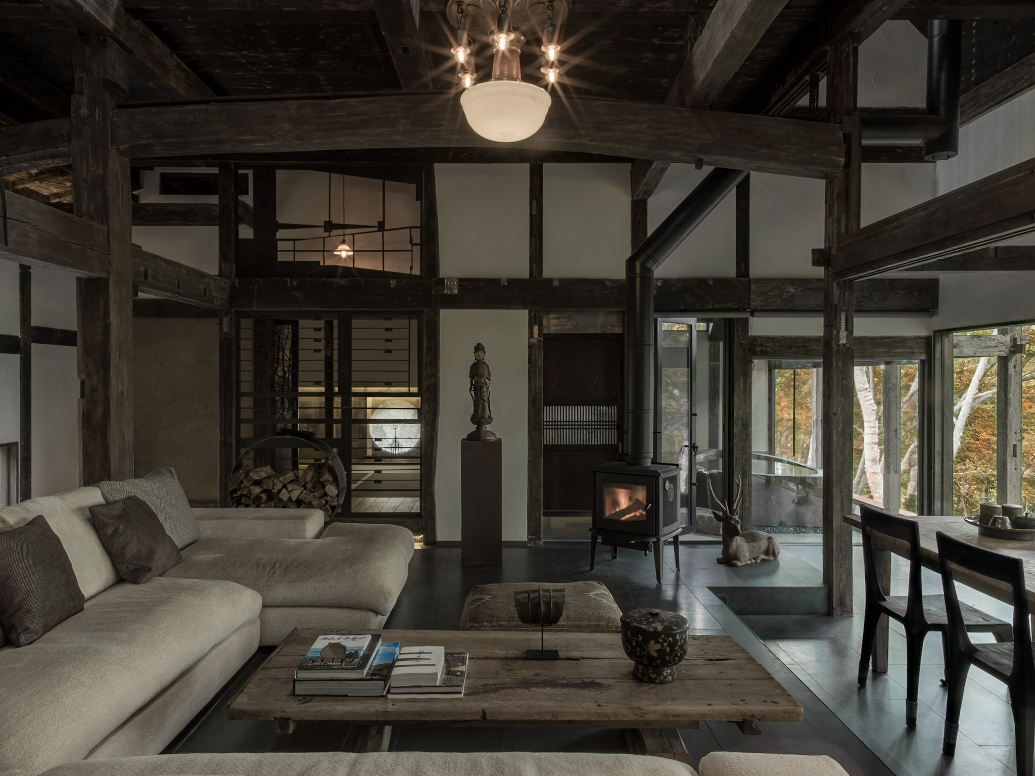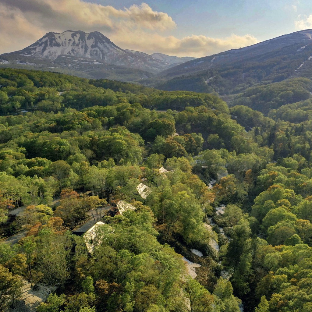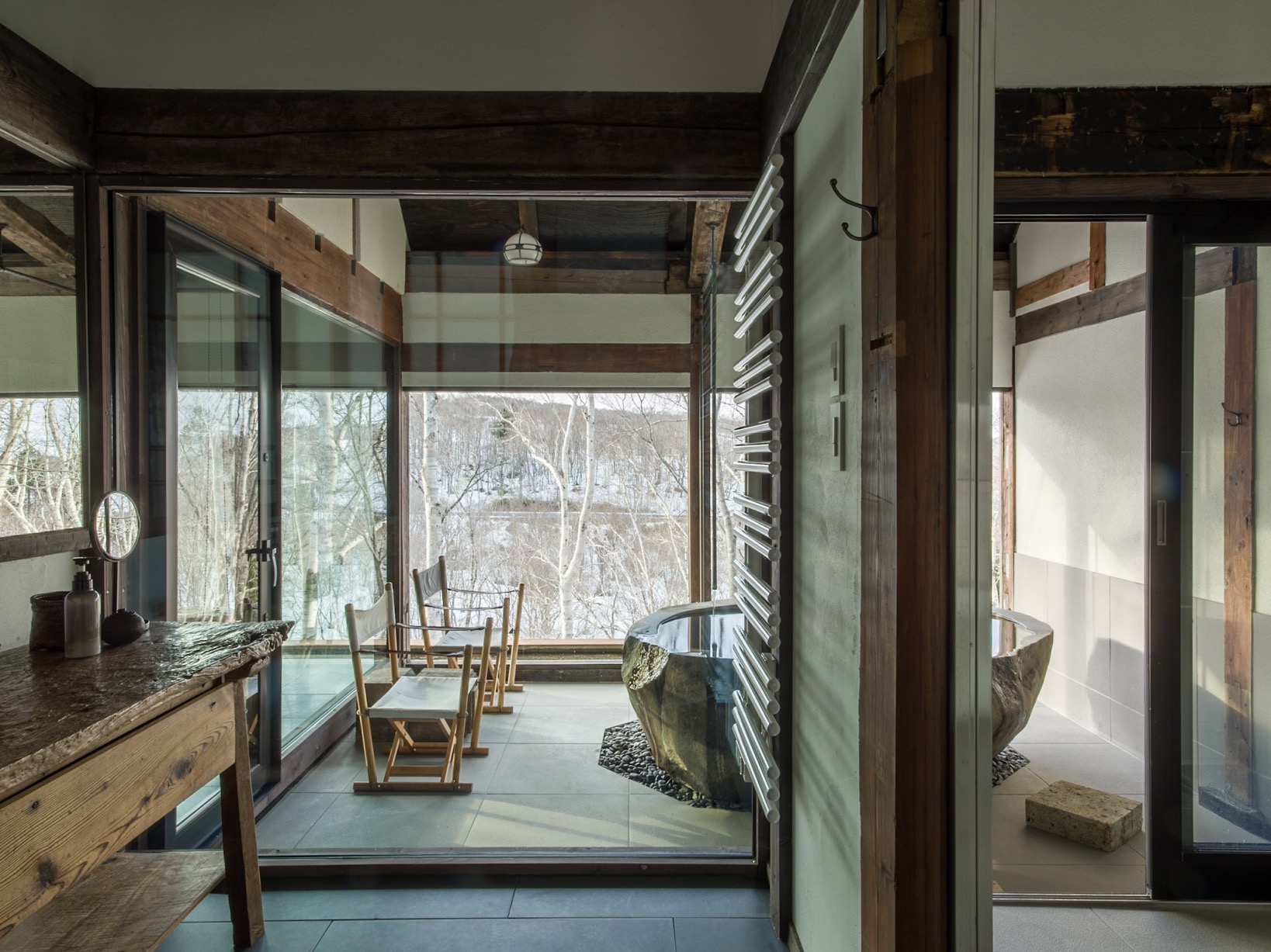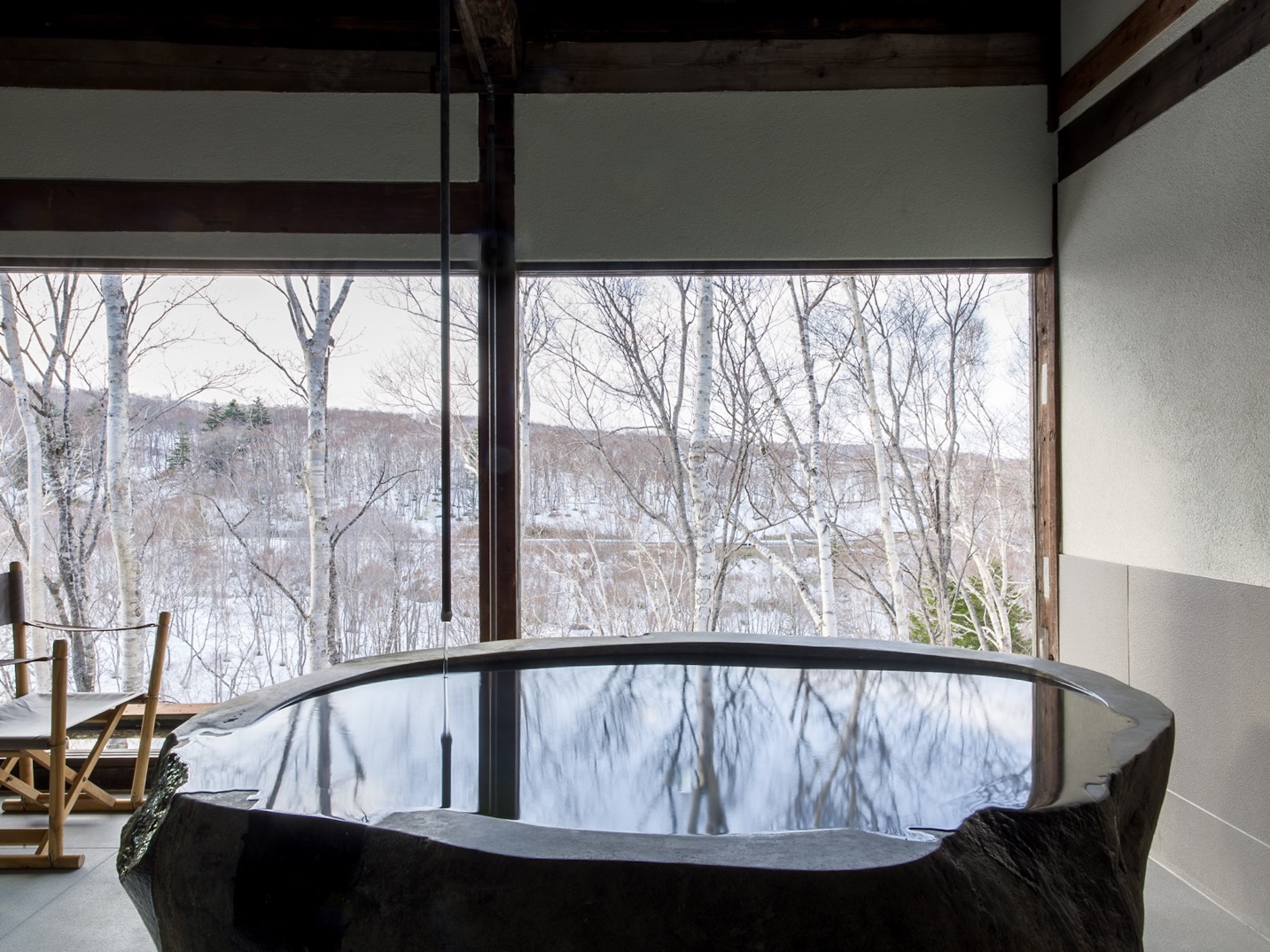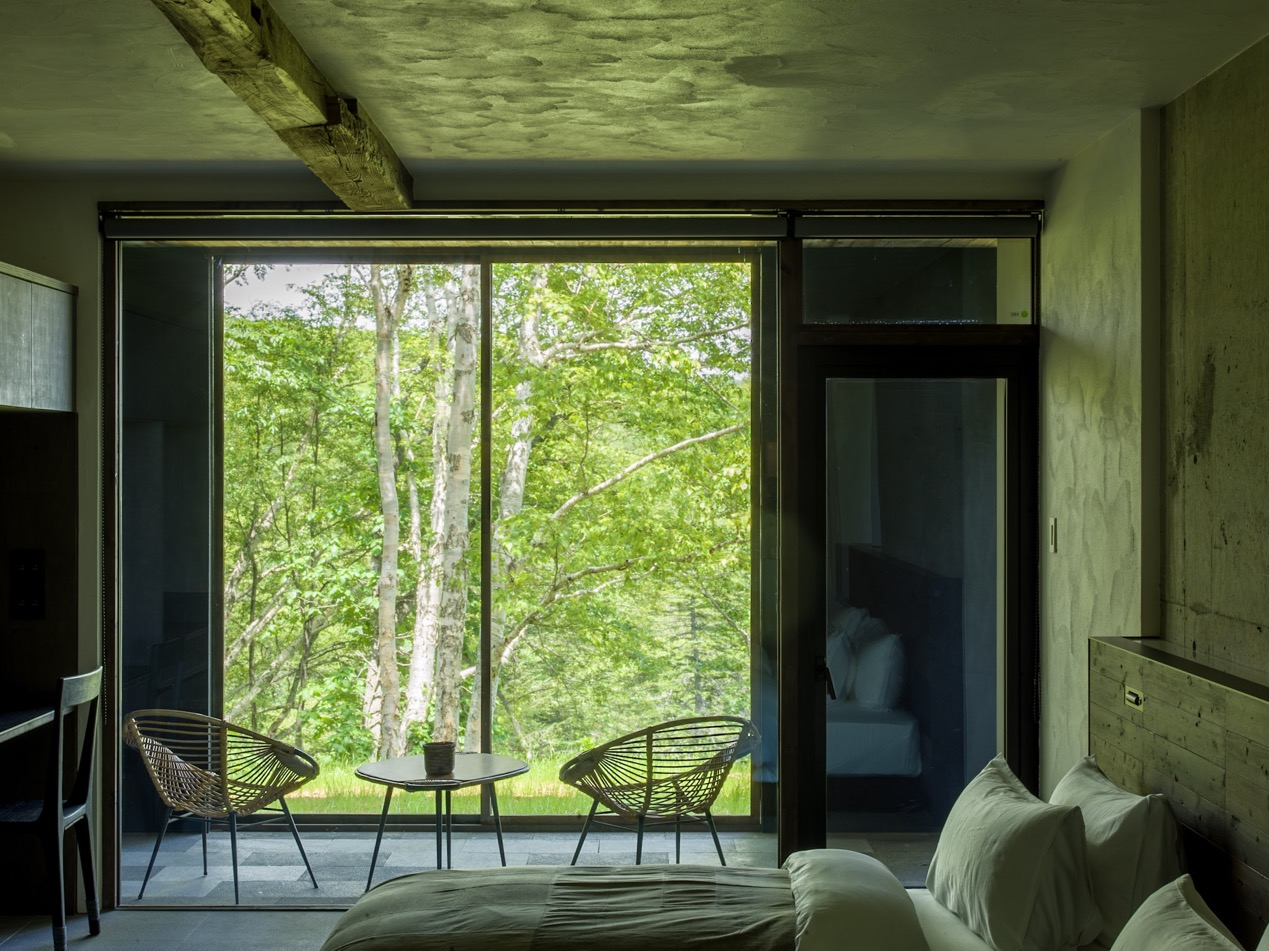 推開廢棄材料改造而成的門板,古民家的沉鬱氣勢立即撲面而來,卻又十分奇異地在通透的開放式格局中,與當代室內設計思維和諧共存。黑白影像化紙門為相紙,隨季節更換的畫作、陶器、私人收藏品點綴著角落,每回入住,都可能置身於不同的風光中;而起居室的大面玻璃窗精巧如框,隨季節流轉不歇的絕景、水面倒映的綠意,正好印證了 Grigg 的信念:「大自然就是最偉大的藝術」。每間客房都設有源泉掛流式溫泉,富含天然保濕成分的柔滑泉水完全未經額外加溫,浴池也由巨石鑿空而成,意味著由裡到外,純然是來自大自然的饋贈。