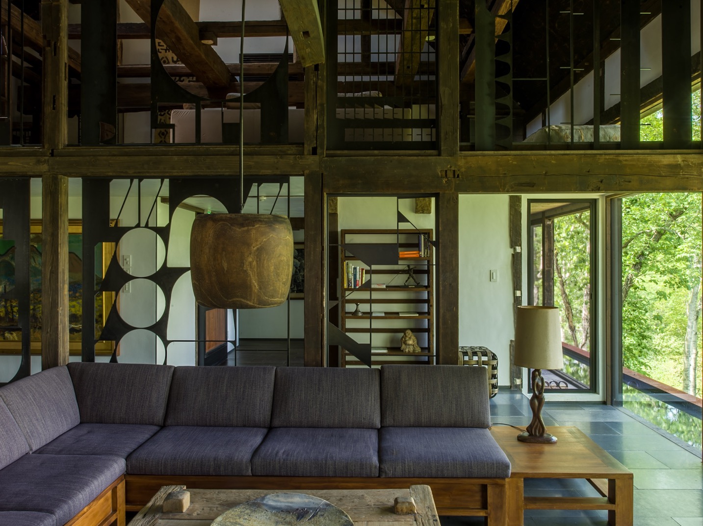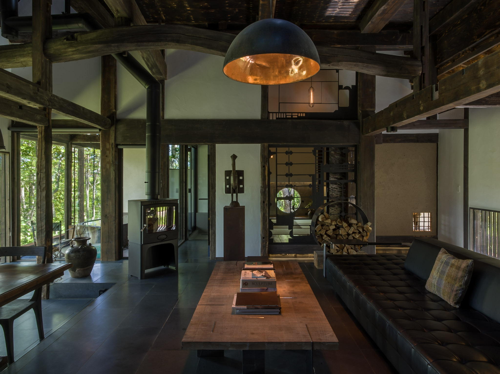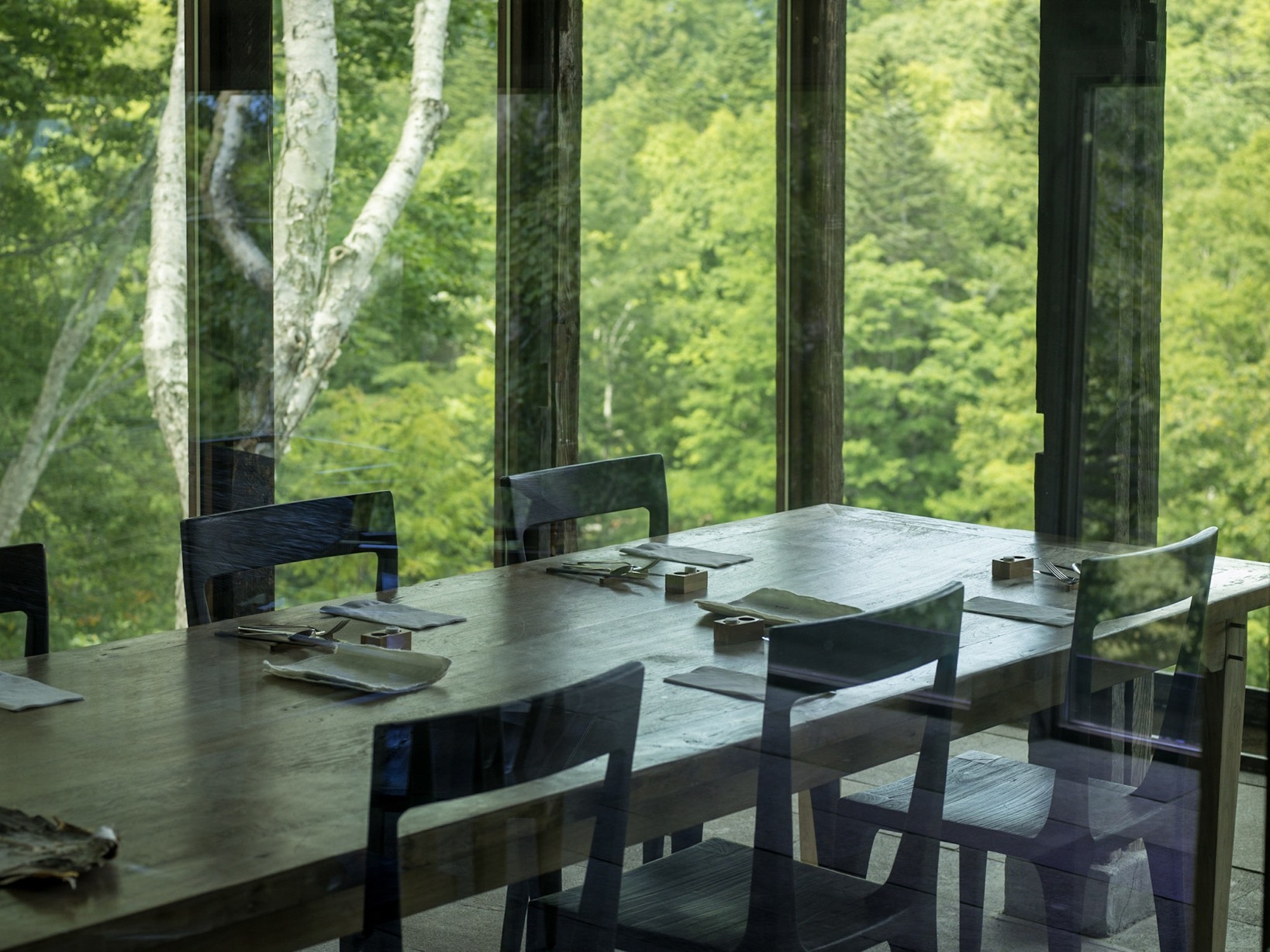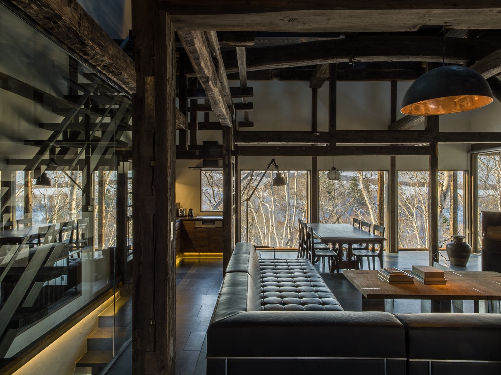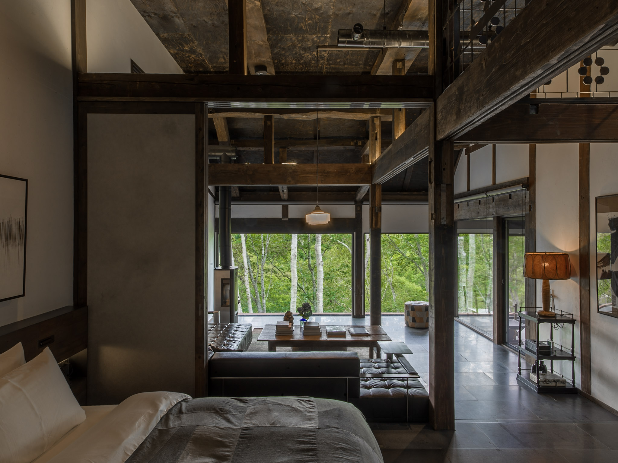 推開廢棄材料改造而成的門板,古民家的沉鬱氣勢立即撲面而來,卻又十分奇異地在通透的開放式格局中,與當代室內設計思維和諧共存。黑白影像化紙門為相紙,隨季節更換的畫作、陶器、私人收藏品點綴著角落,每回入住,都可能置身於不同的風光中;而起居室的大面玻璃窗精巧如框,隨季節流轉不歇的絕景、水面倒映的綠意,正好印證了 Grigg 的信念:「大自然就是最偉大的藝術」。每間客房都設有源泉掛流式溫泉,富含天然保濕成分的柔滑泉水完全未經額外加溫,浴池也由巨石鑿空而成,意味著由裡到外,純然是來自大自然的饋贈。