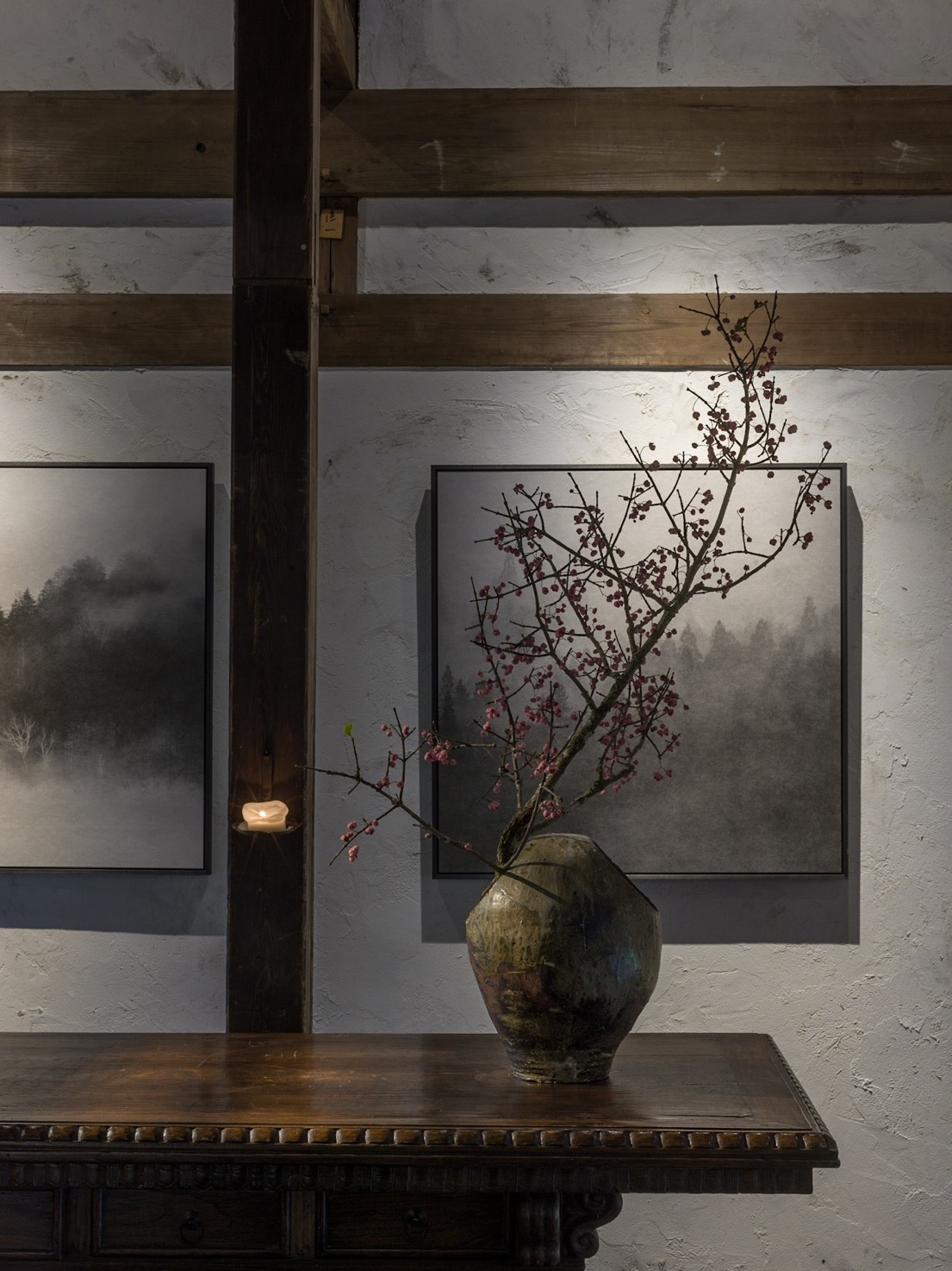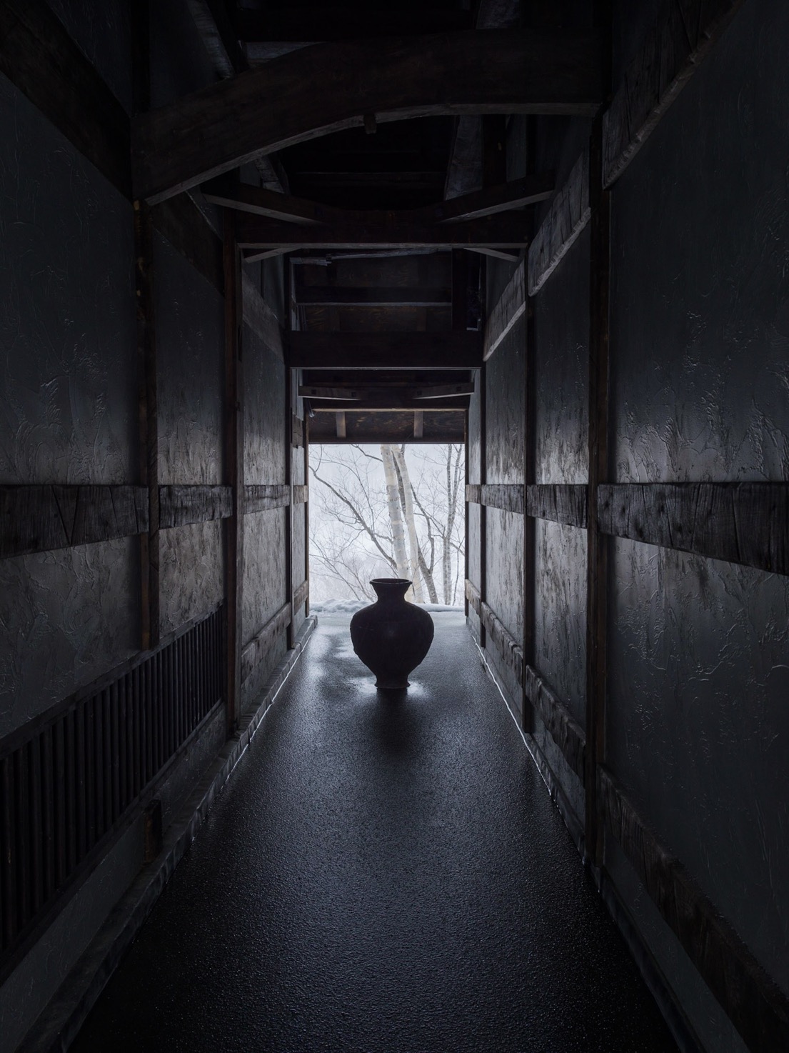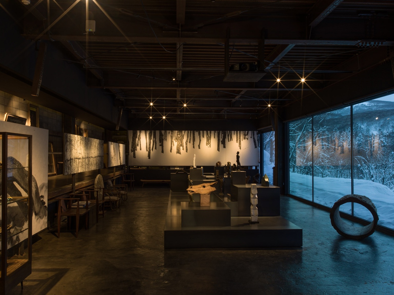除了餐廳 SOMOZA 設有展出繩文時代器物的畫廊,讓人細細探索北海道的歷史與文化,SHIGUCHI 內亦設有僅供入住旅人參訪的藝廊。在這更為私密的藝術空間中,展示著 Shouya Grigg 所收藏的世界各地文物藝品以及他自己的創作。他將自己的攝影印於薄巧卻堅韌的日本紙,再用墨水、木炭細膩繪製作品細節,將北海道迷人的雪地風光,落筆為一幅幅純粹、寂靜的黑白極簡光景。