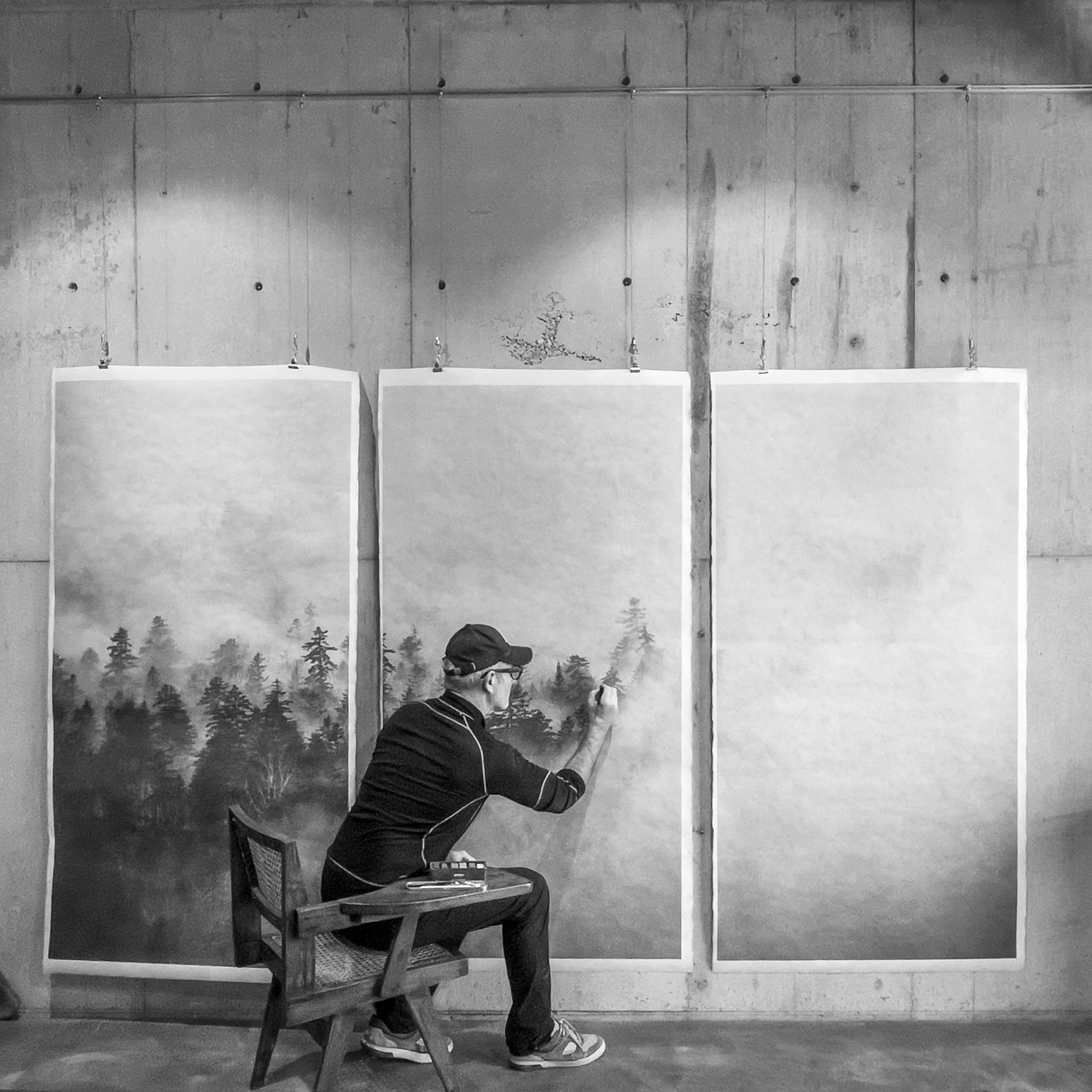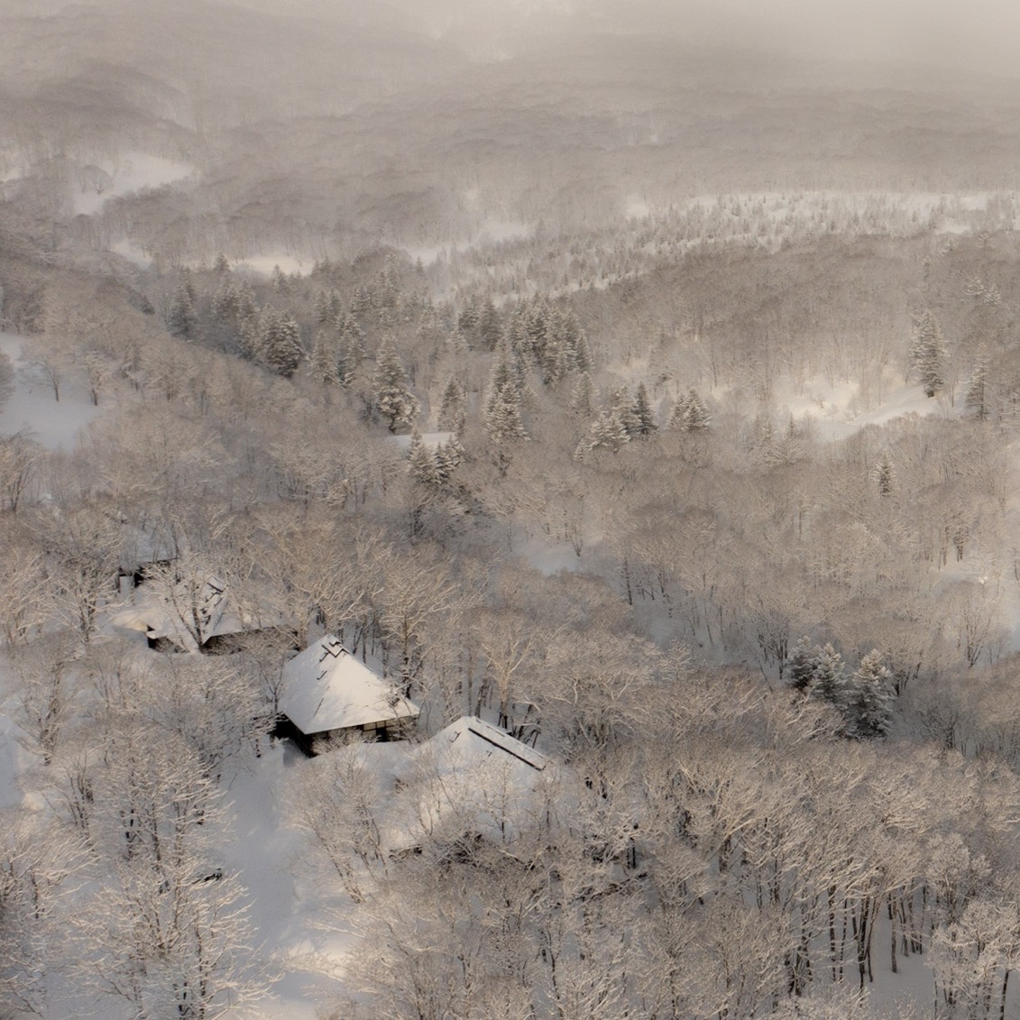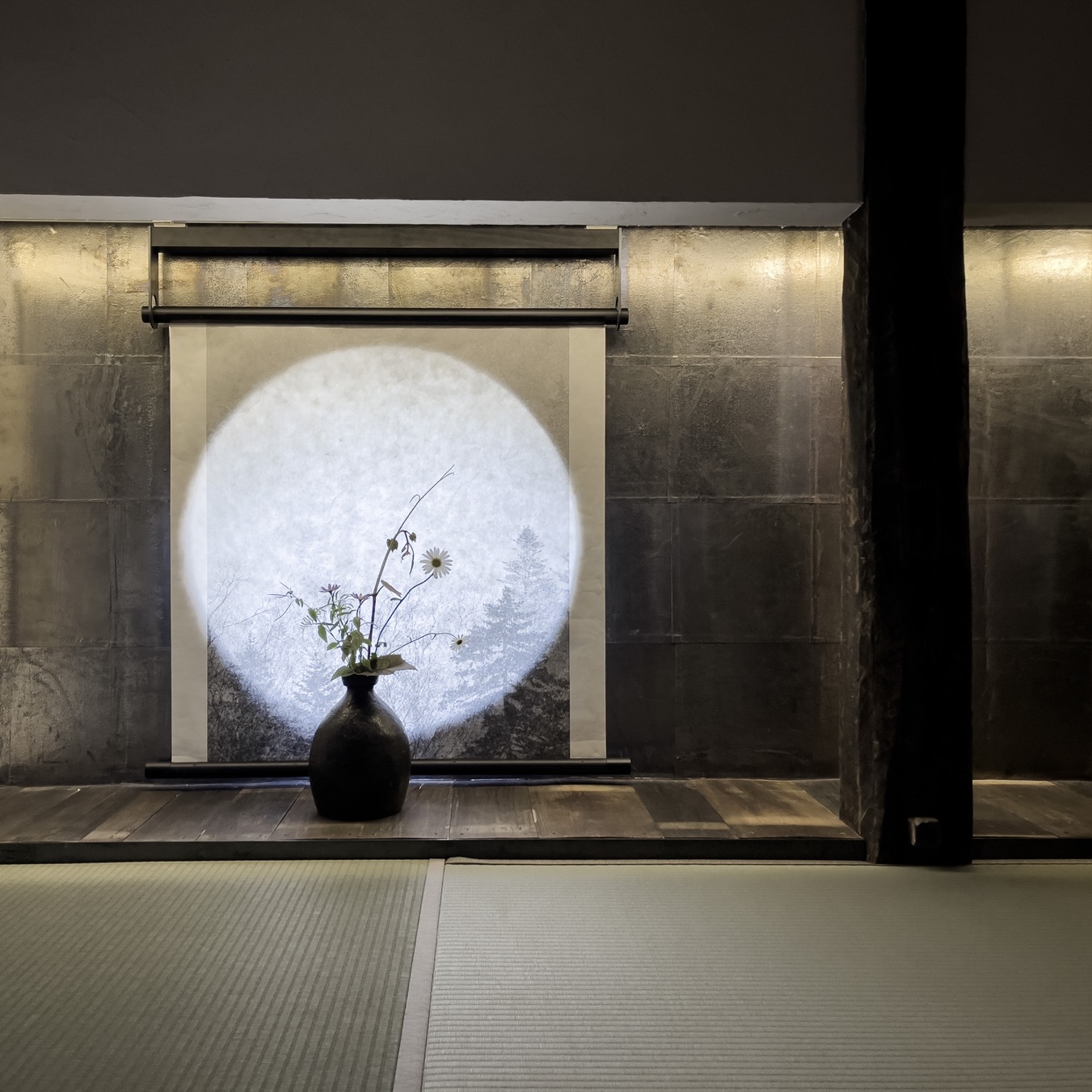 除了餐廳 SOMOZA 設有展出繩文時代器物的畫廊,讓人細細探索北海道的歷史與文化,SHIGUCHI 內亦設有僅供入住旅人參訪的藝廊。在這更為私密的藝術空間中,展示著 Shouya Grigg 所收藏的世界各地文物藝品以及他自己的創作。他將自己的攝影印於薄巧卻堅韌的日本紙,再用墨水、木炭細膩繪製作品細節,將北海道迷人的雪地風光,落筆為一幅幅純粹、寂靜的黑白極簡光景。